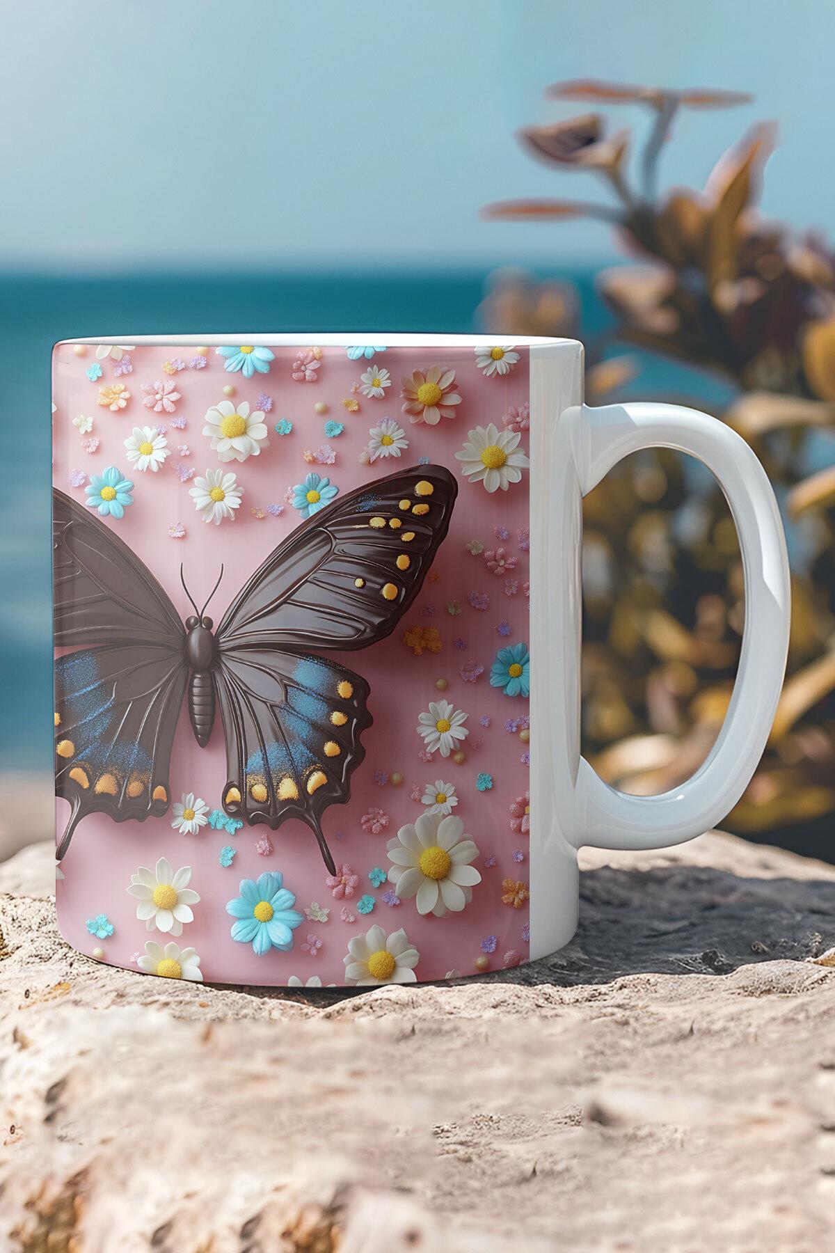 3D Görünümlü Kelebek Ve Çiçek Desenli Baskılı Kupa Bardak