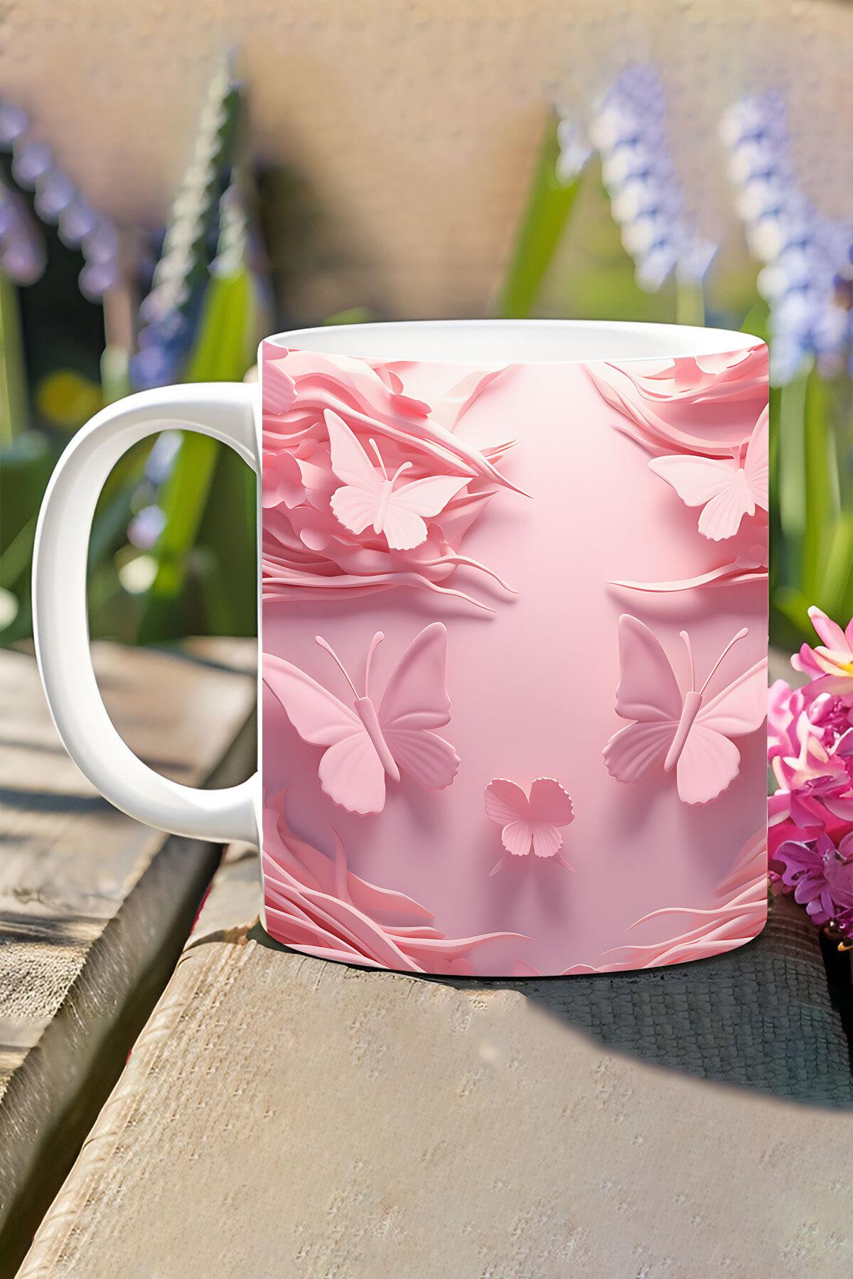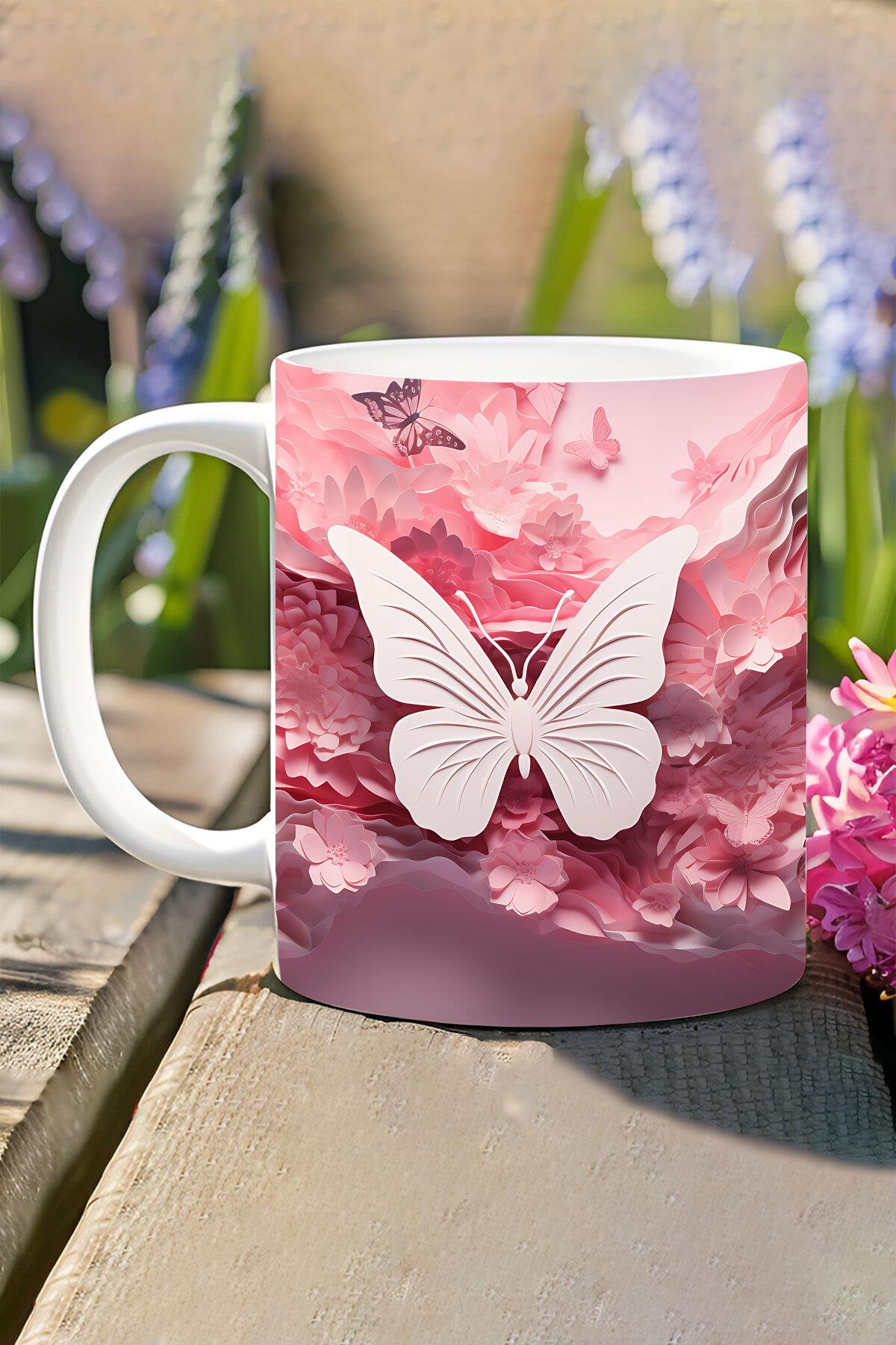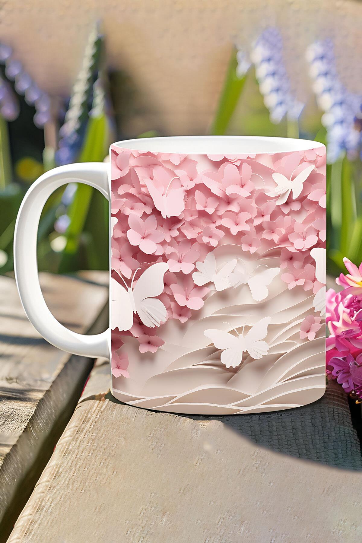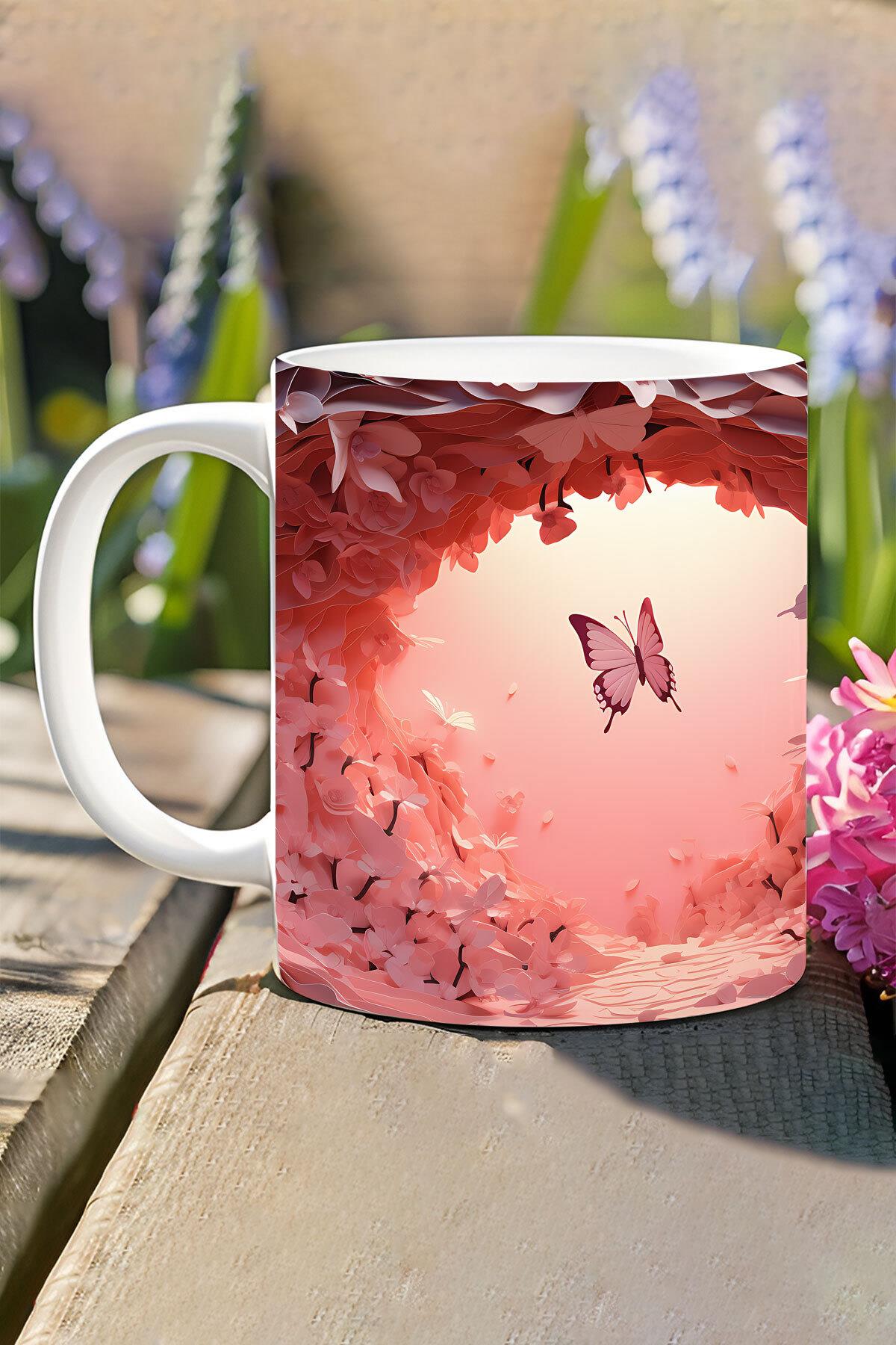 3D Görünümlü Pembe Çiçek ve Kelebekler No:1 3D Tasarım Baskılı Kupa Bardak Mug
