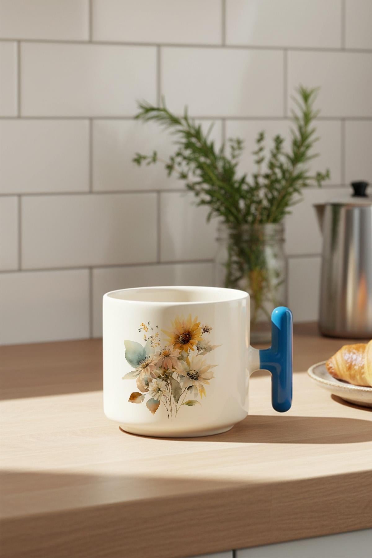 Ayçiçekleri Sonbahar Teması No:2 Baskılı Hediyelik T Kulplu Latte Fincanı Kupa Bardak