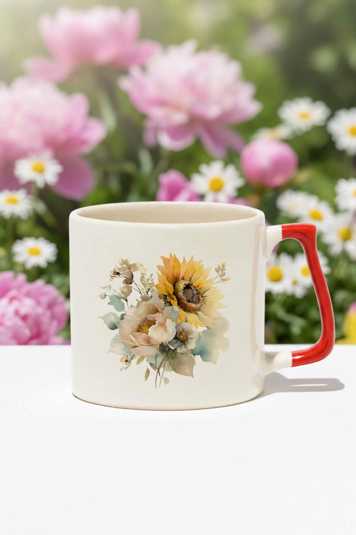 Ayçiçekleri Sonbahar Teması No:3 Baskılı Kırmızı D Kulplu Kupa Bardak