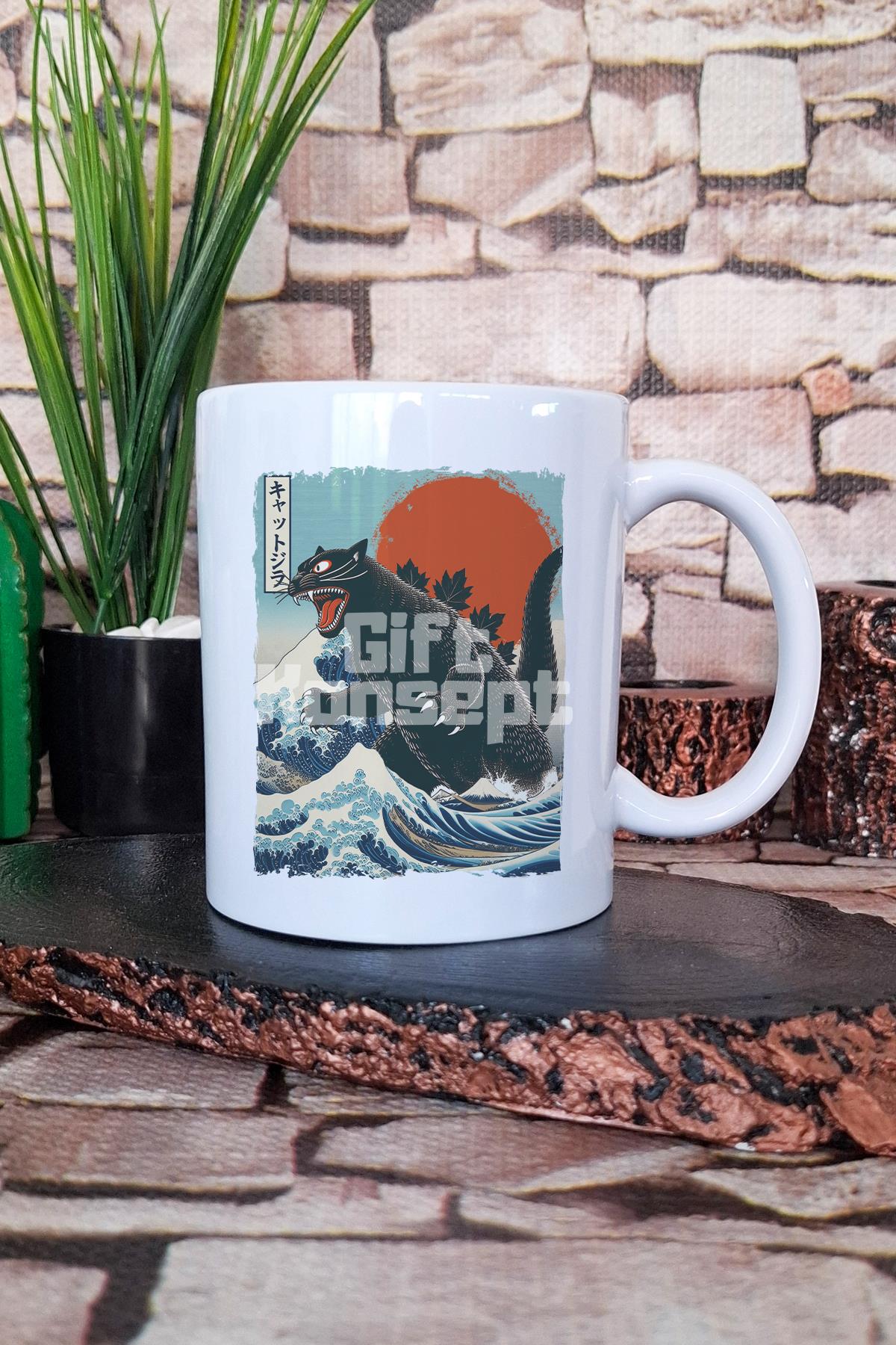 Catzilla Baskılı Japon Sevimli Kedi Anime Manga Hediyelik Baskılı Çay Kahve Sunum Kupa Bardak