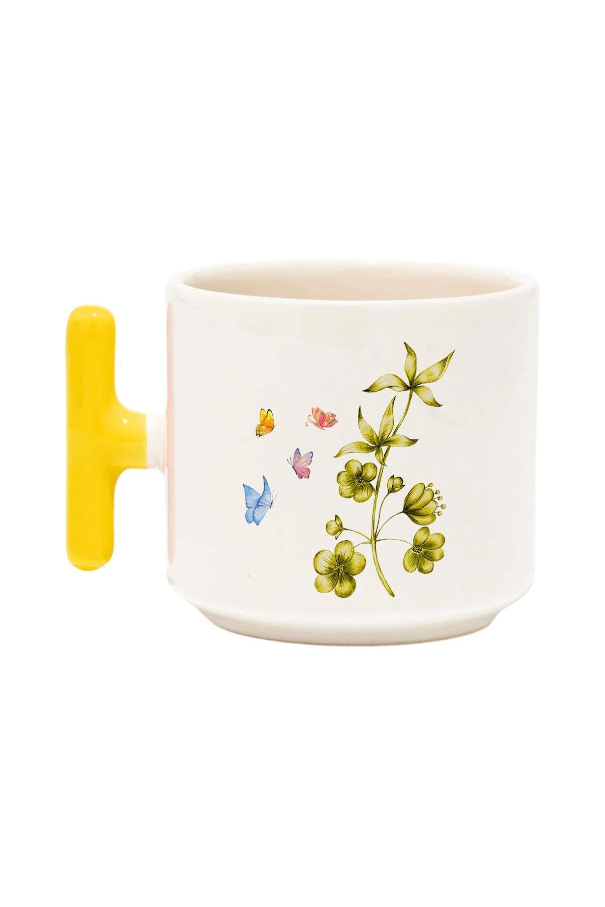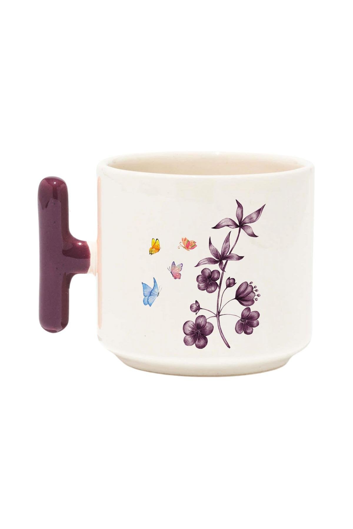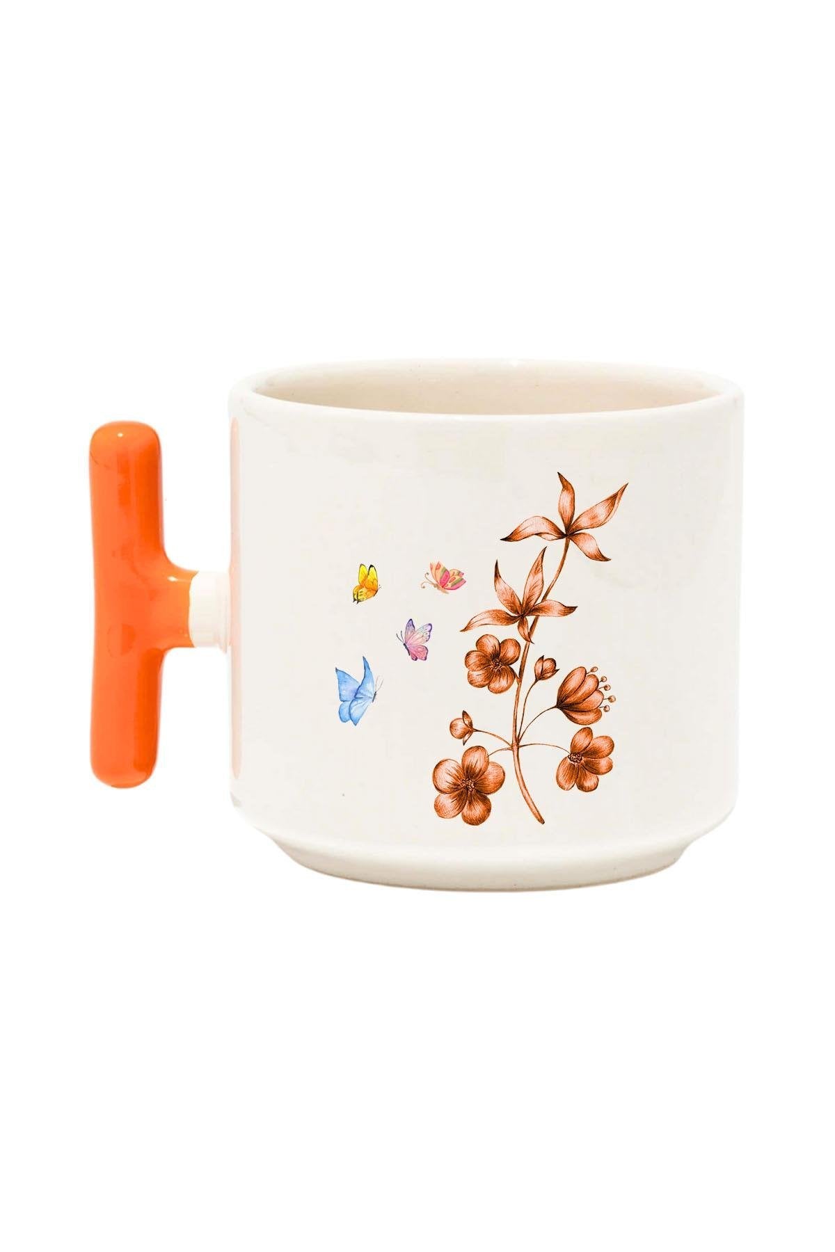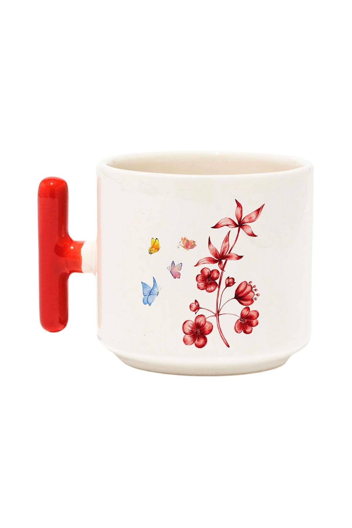 Çiçek Dalında Uçuşan Kelebekler Baskılı Renkli T Kulplu Hediyelik Latte Fincanı Kupa Bardak