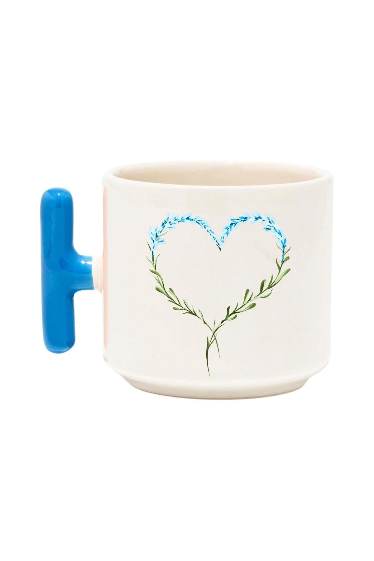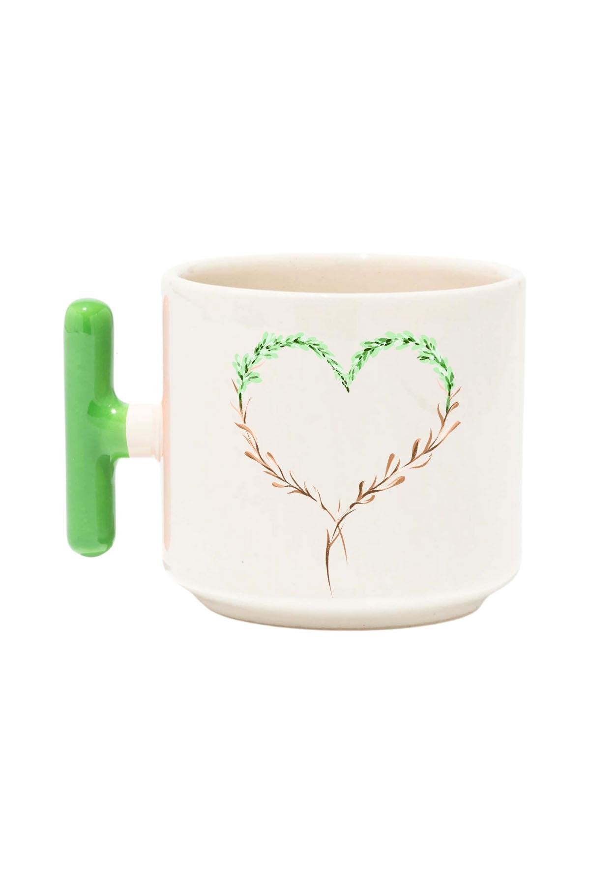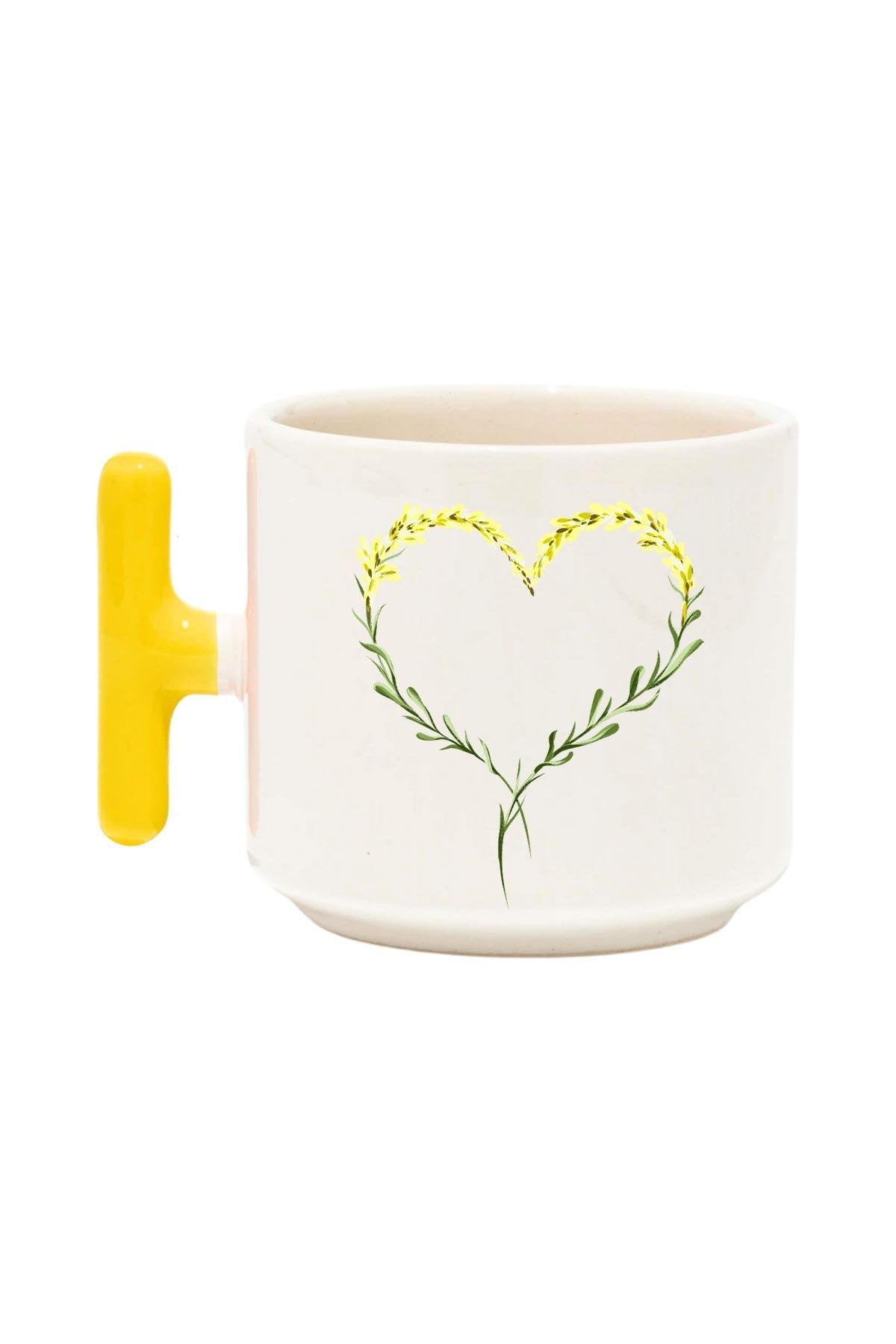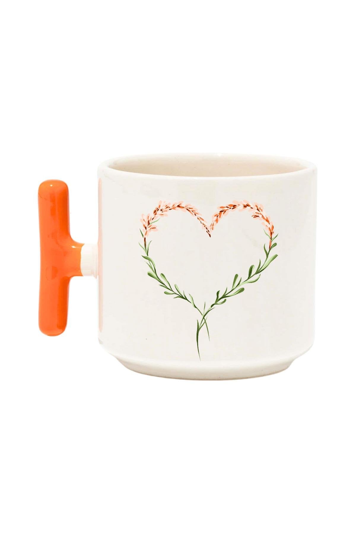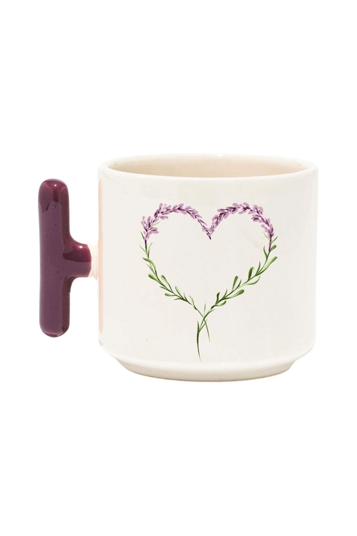 Çiçek Süslemeli Kalp Baskılı Renkli T Kulplu Hediyelik Latte Fincanı Kupa Bardak