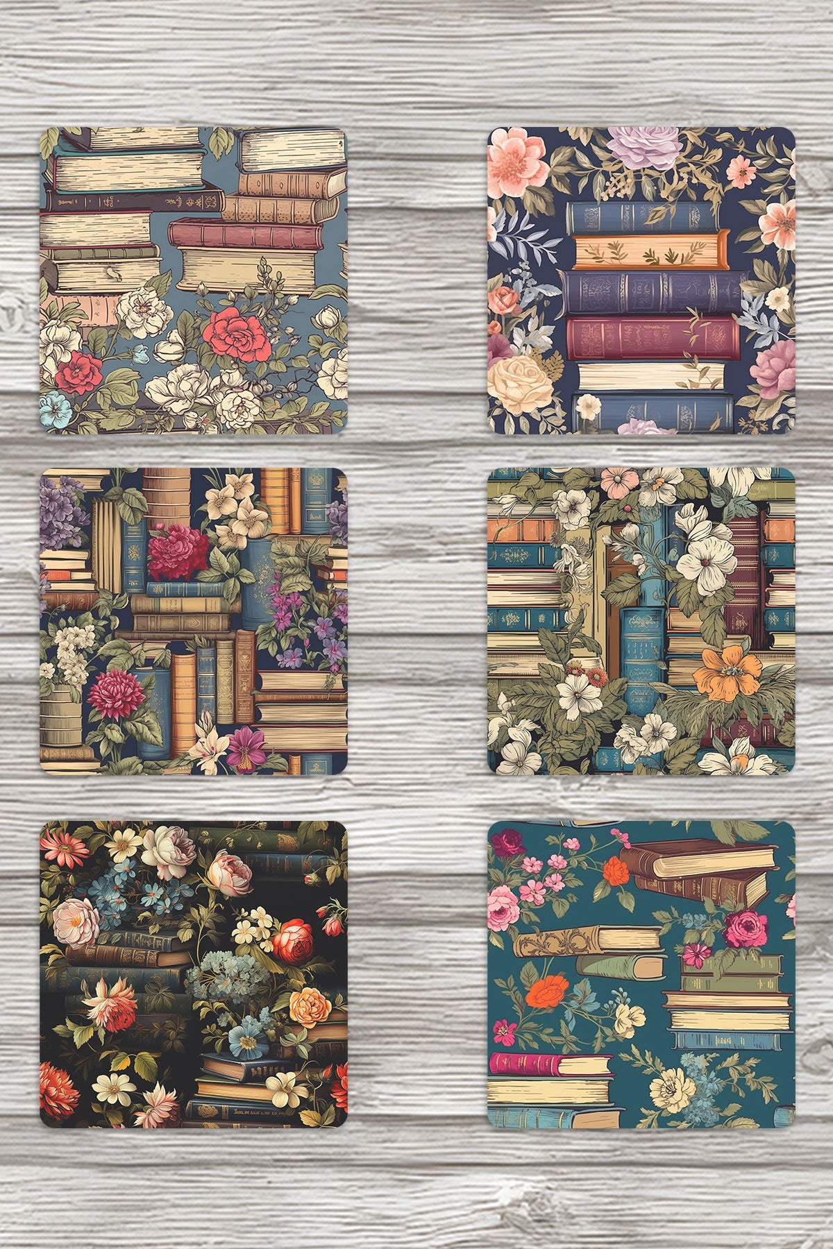 Çiçek ve Kitaplar No:1 Baskılı 6'lı Set Dekoratif Ahşap Kare Bardak Altlığı