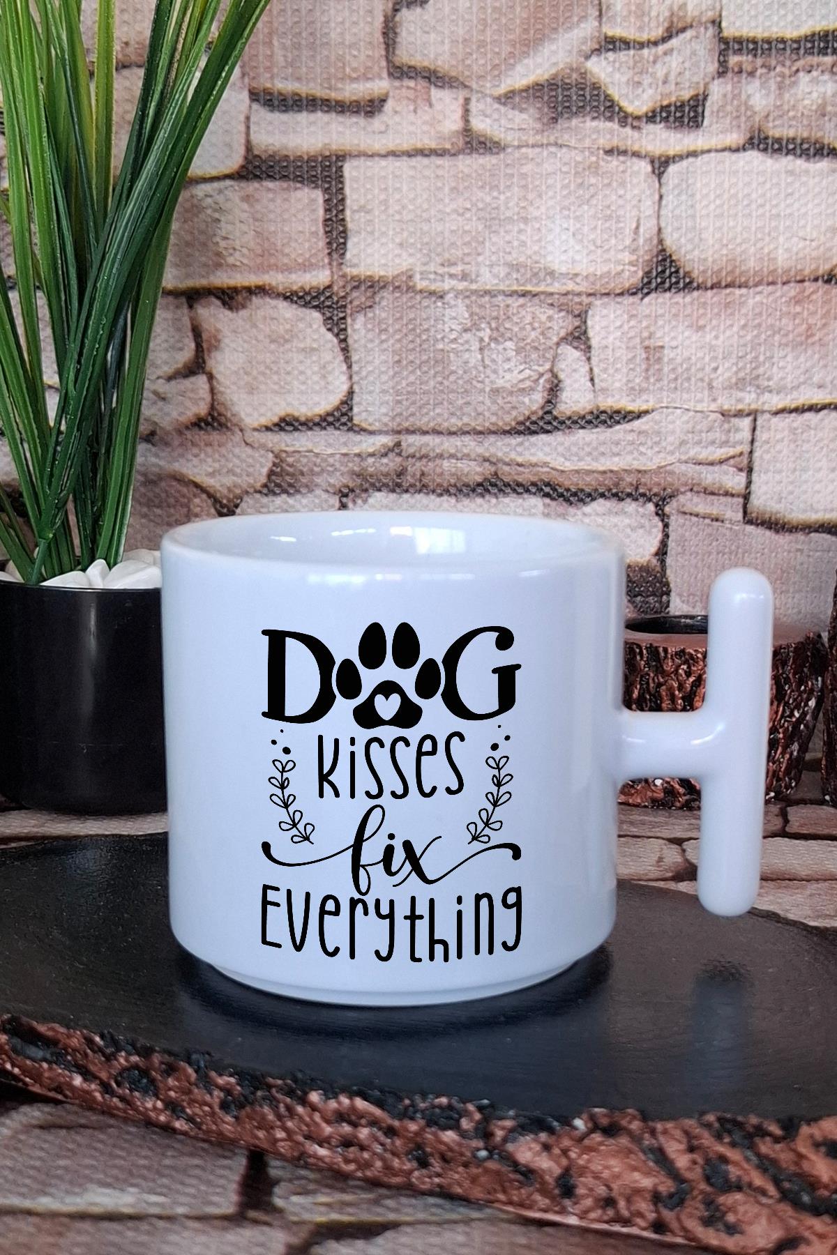 Dog Kisses Fix Everything Yazılı Köpeksever Hediyelik Baskılı T Kulplu Latte Fincanı Kupa Bardak