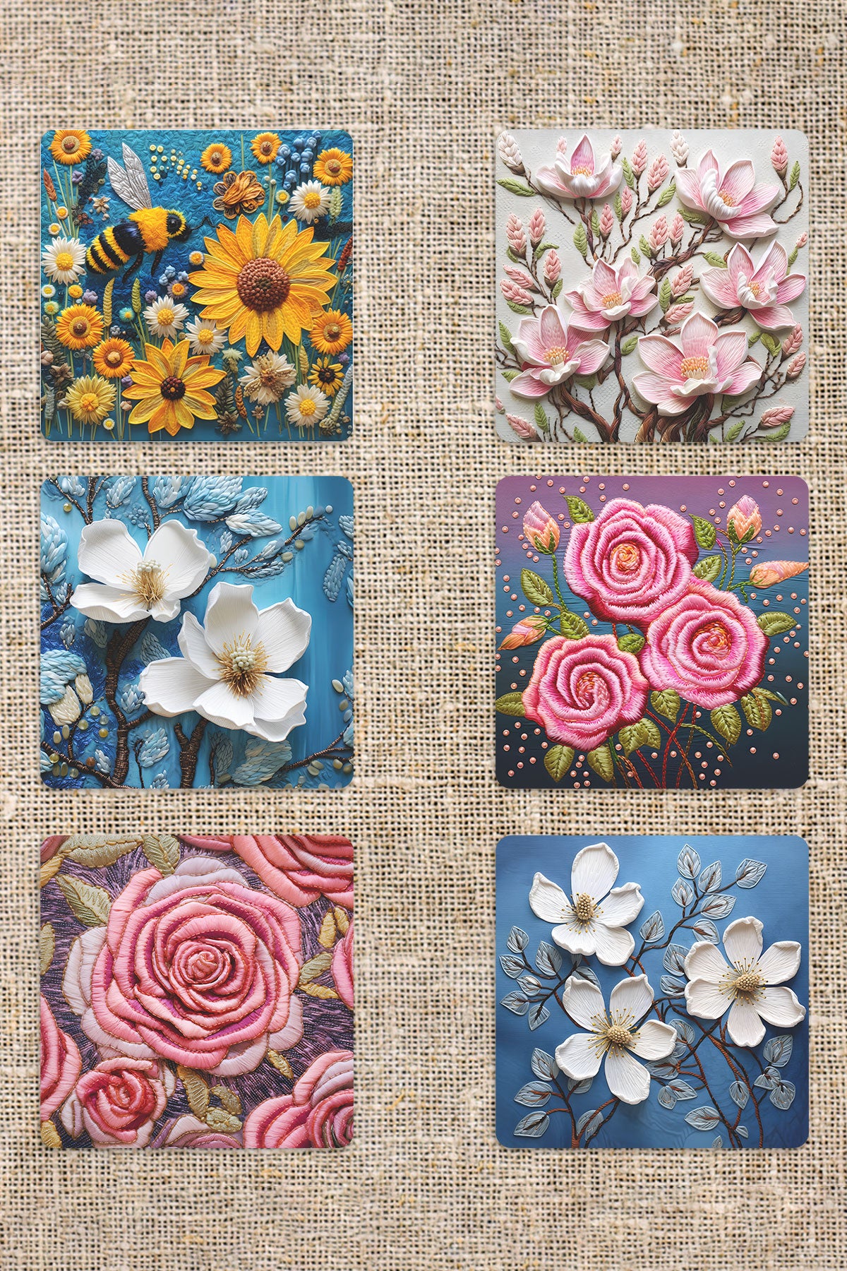 Doğal Çiçekler Temalı Hediyelik Baskılı 6'lı Set Dekoratif Ahşap Kare Bardak Altlığı