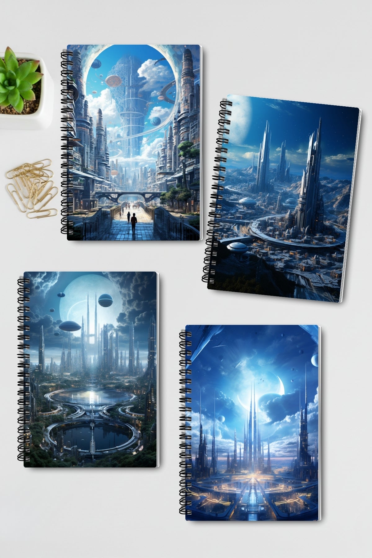 Fütüristik Şehirler Temalı Tasarım Tel Spiralli 4'lü Hatıra Günlük Ajanda Anı Okul Defter Seti