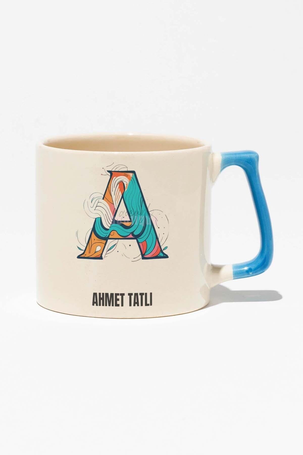 Harfli İsme Özel Baskılı Mavi Kulplu Modern Seramik Kupa