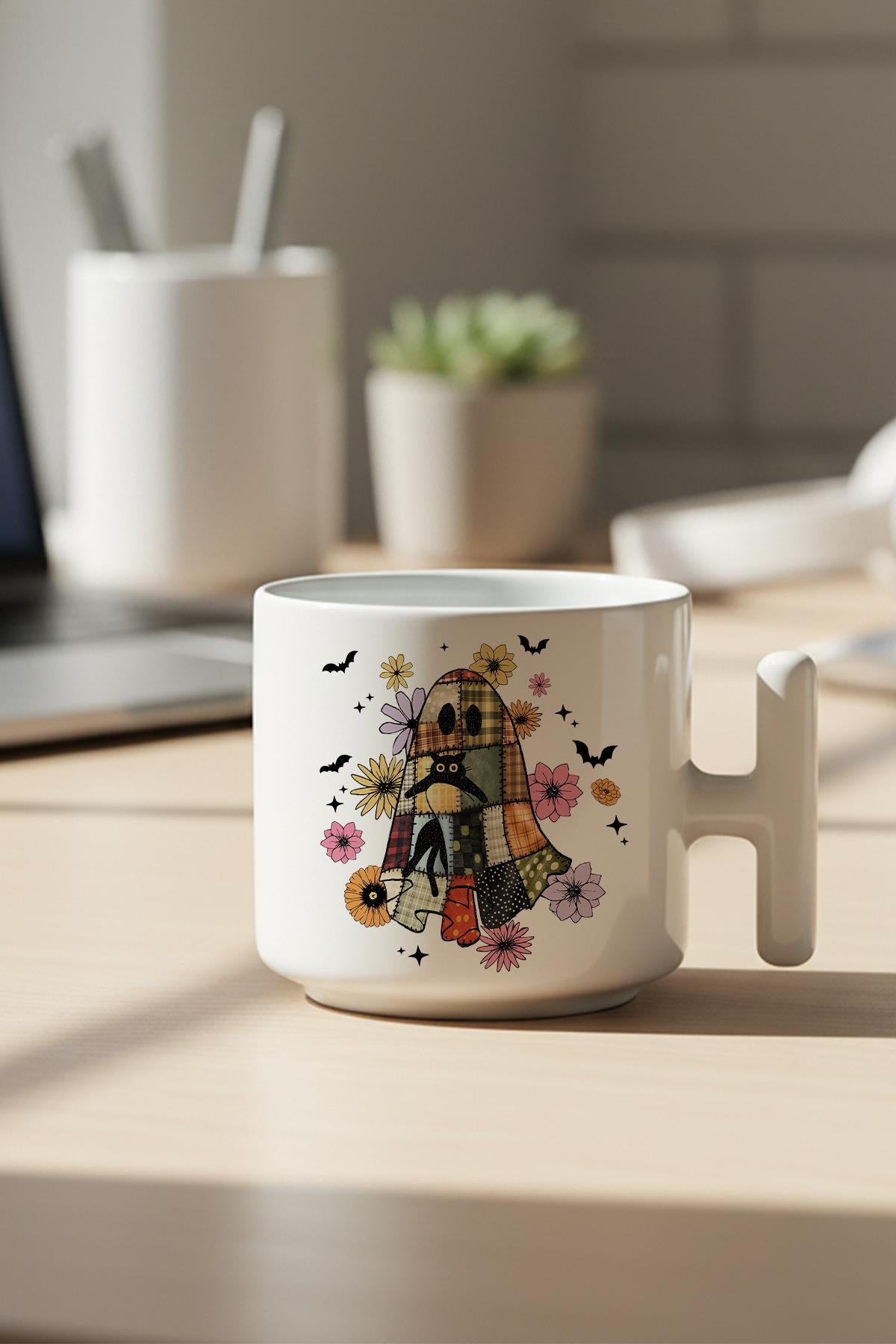 Hayalet Ve Sevimli Kedi Baskılı Hediyelik T Kulplu Latte Fincanı Kupa Bardak