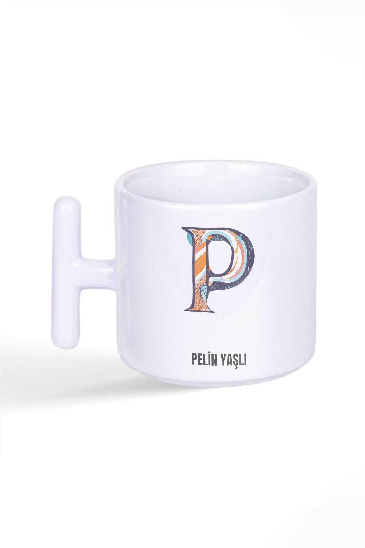 İsme Özel Kişiselleştirilebilir P Harfi Baskılı Latte Fincanı T Kulplu Kupa Bardak