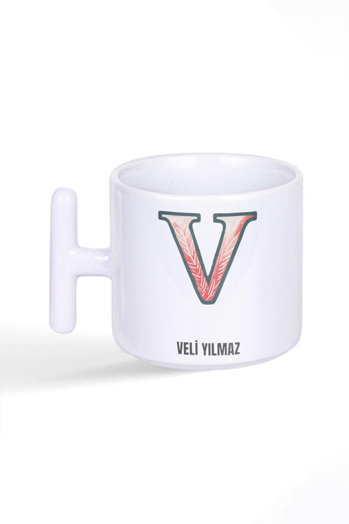 İsme Özel Kişiselleştirilebilir V Harfi Baskılı Latte Fincanı T Kulplu Kupa Bardak