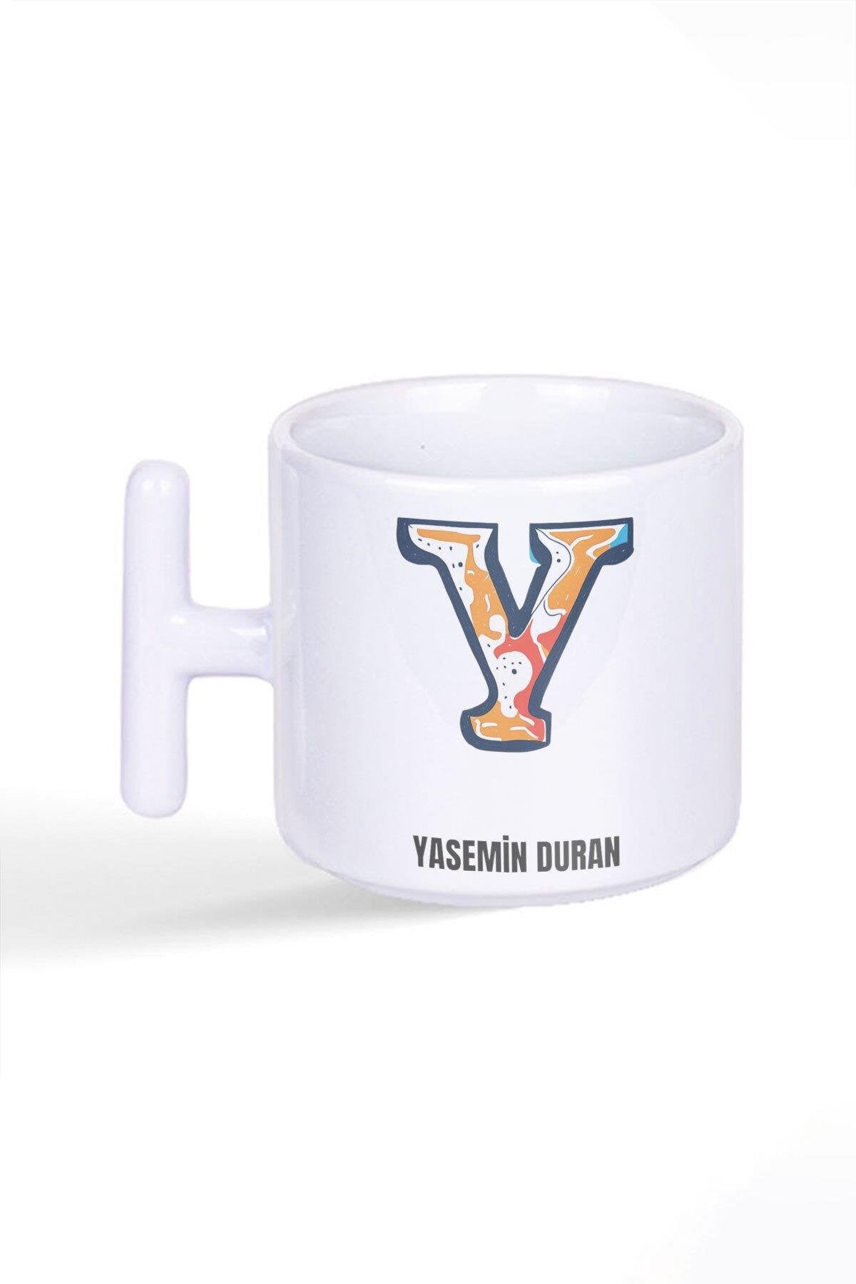 İsme Özel Kişiselleştirilebilir Y Harfi Baskılı Latte Fincanı T Kulplu Kupa Bardak