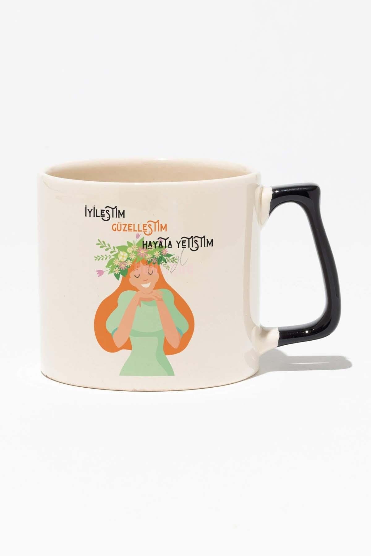 İyileştim Güzelleştim Hayata Yetiştim Motivasyon Hediyelik Baskılı Siyah Kulplu Modern Seramik Kupa