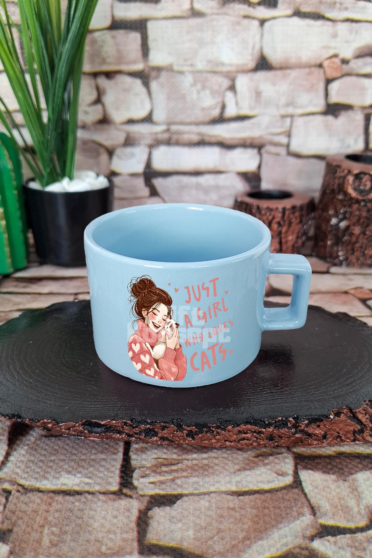 Just A Girl Who Loves Cats Temalı Kedi Aşığı Kız Kare Kulplu Fincan Mavi Kupa Bardak