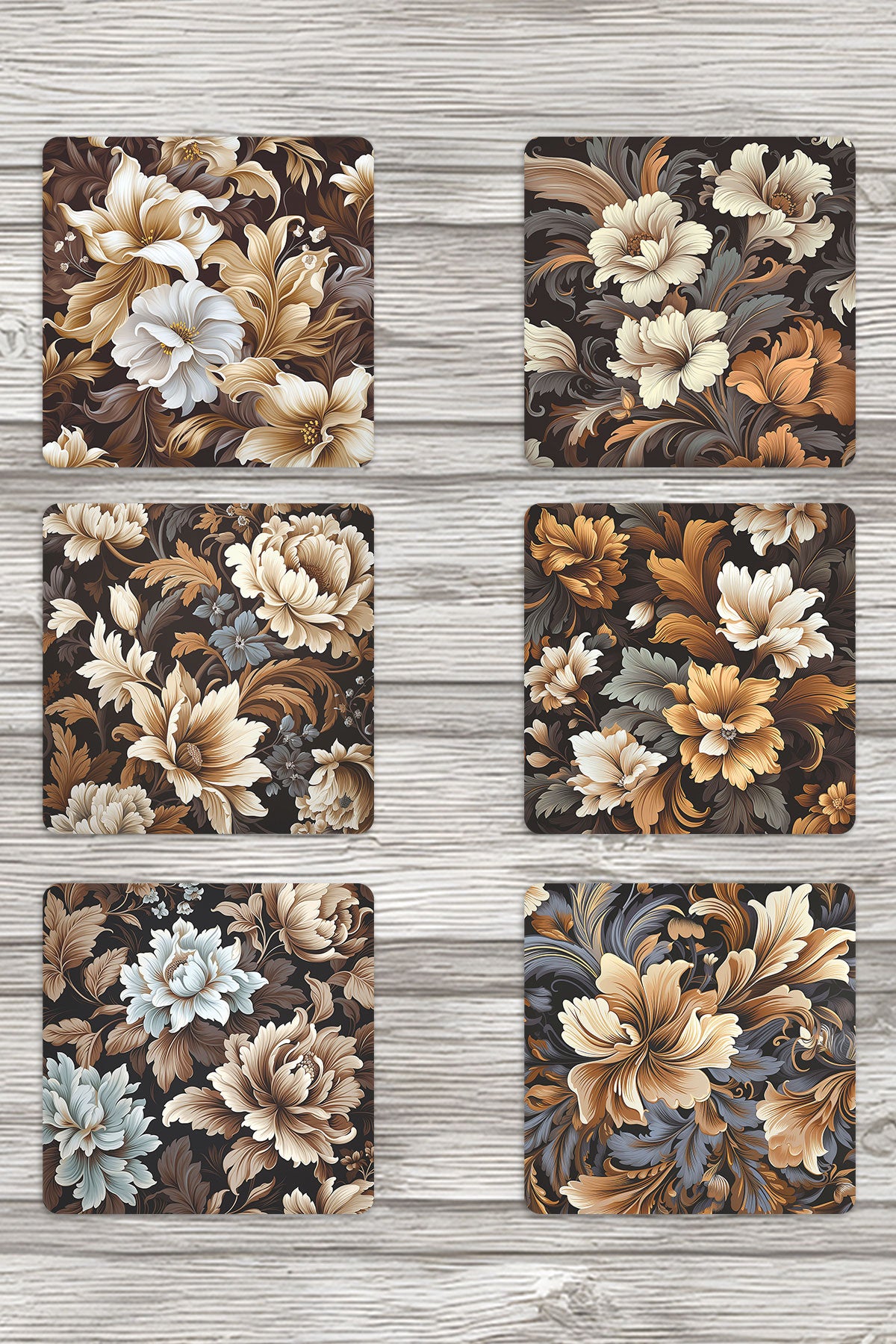 Kahverengi Temalı Çiçekler No:1 Baskılı 6'lı Set Dekoratif Ahşap Kare Bardak Altlığı