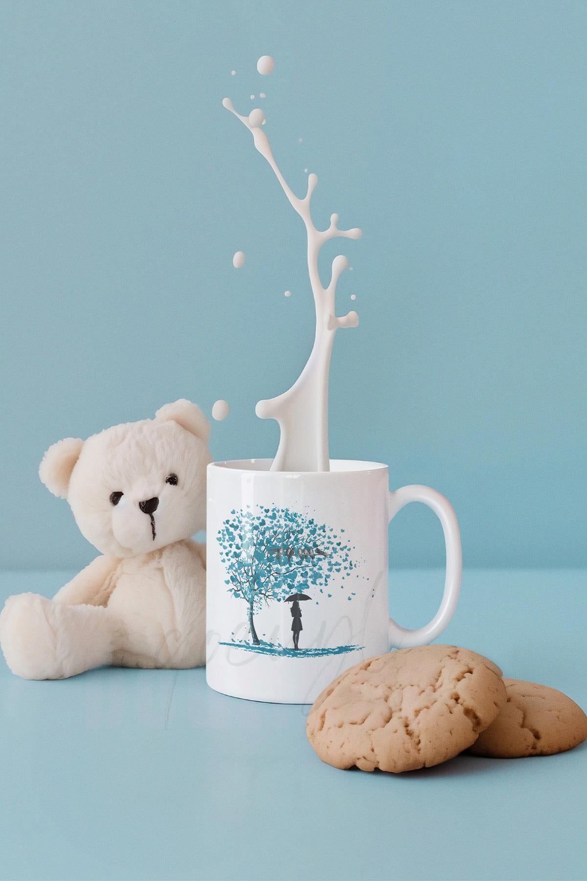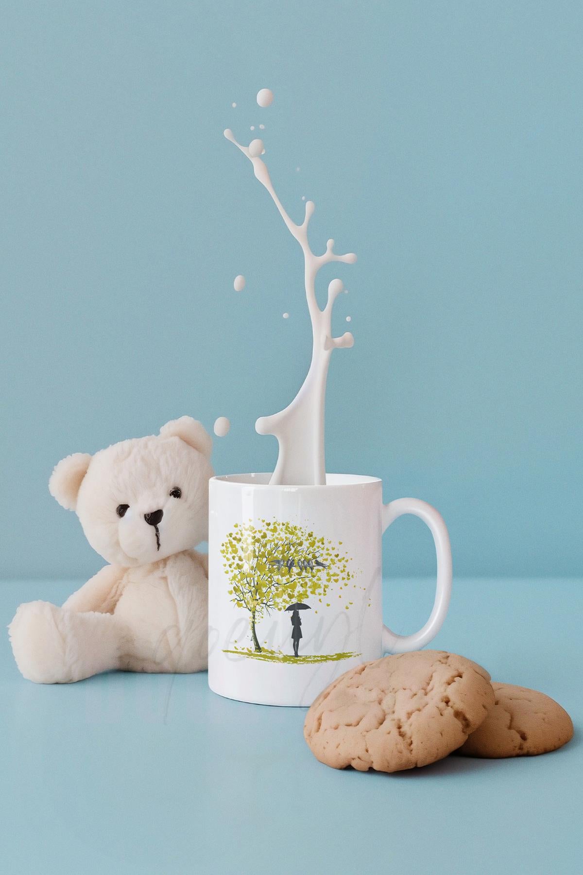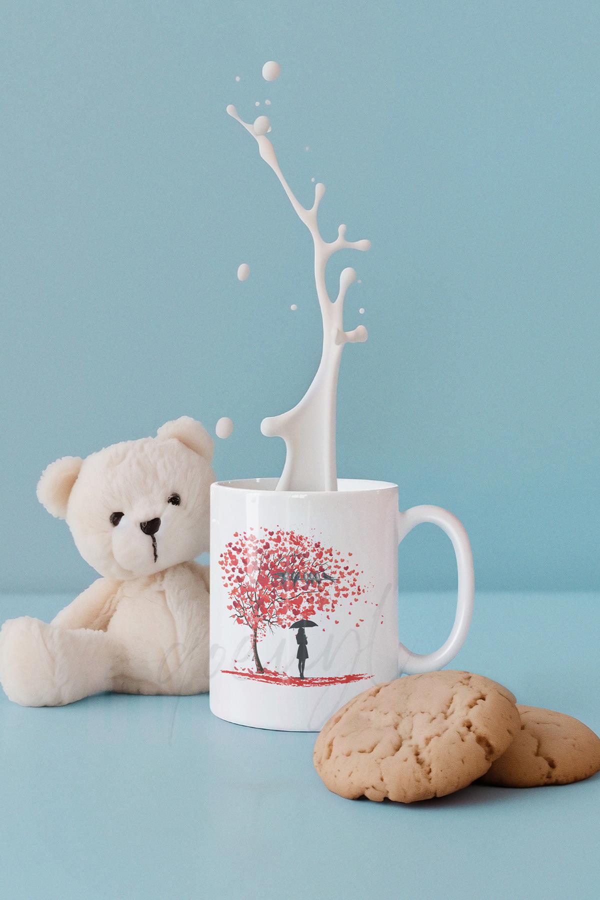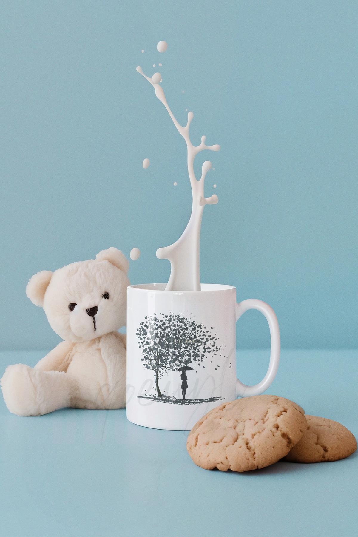 Kalp Yapraklı Hayat Ağacı ve Kuş Baskılı Romantik Hediyelik Beyaz Kupa Bardak
