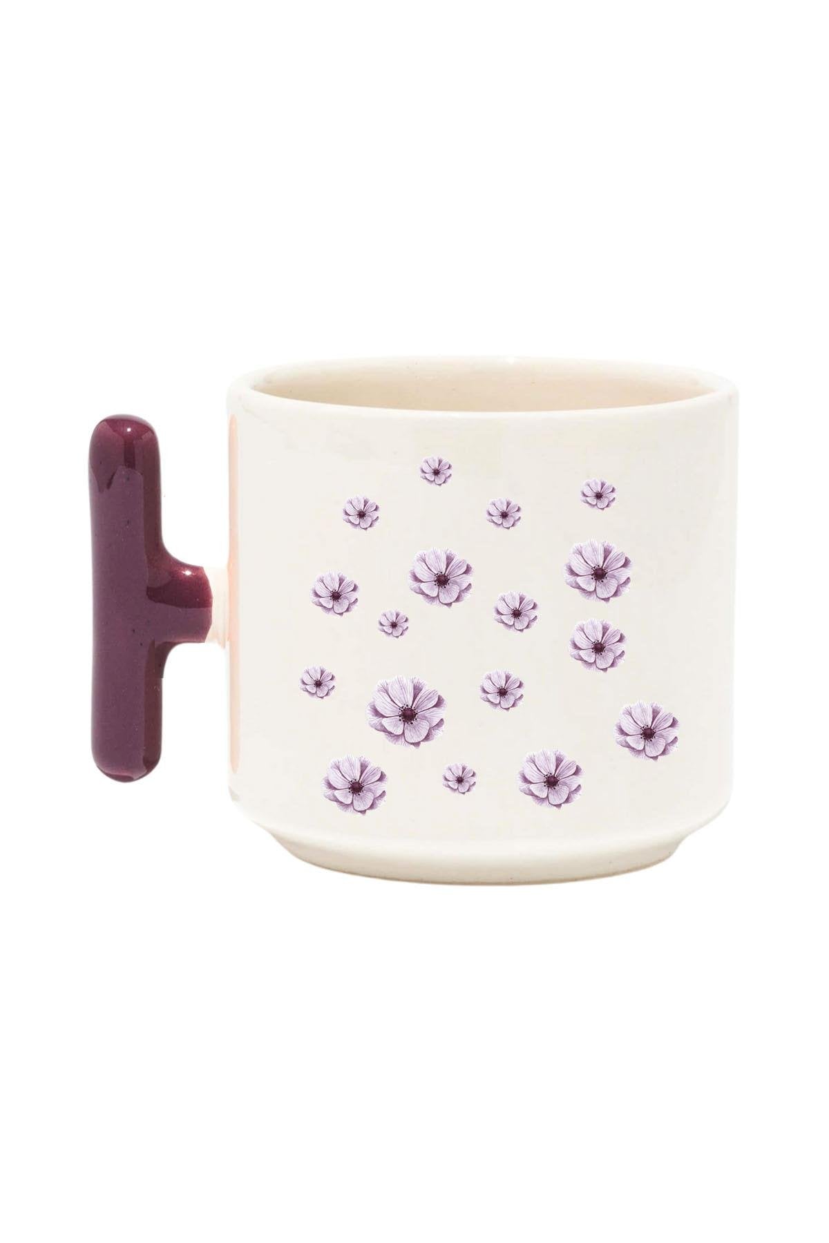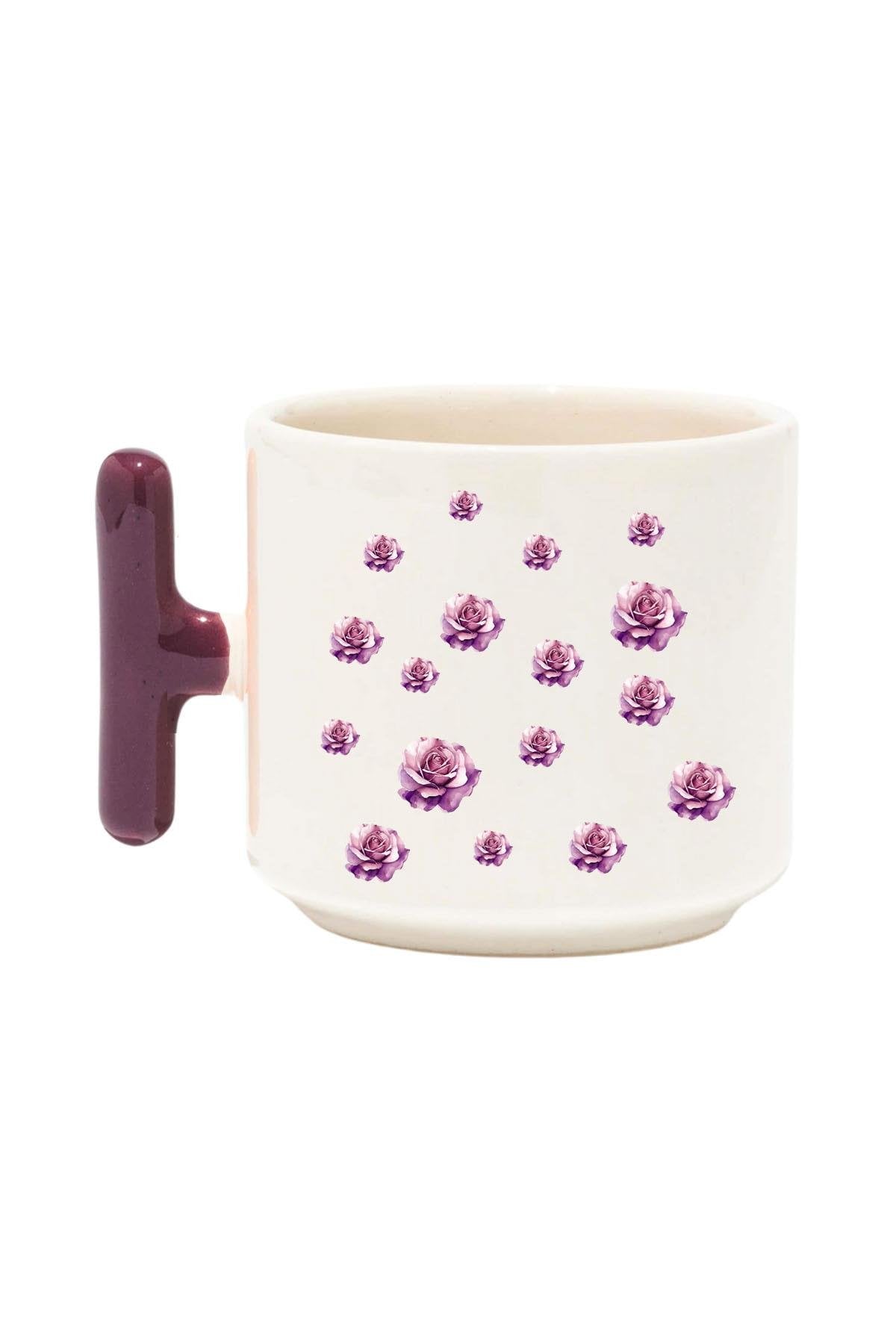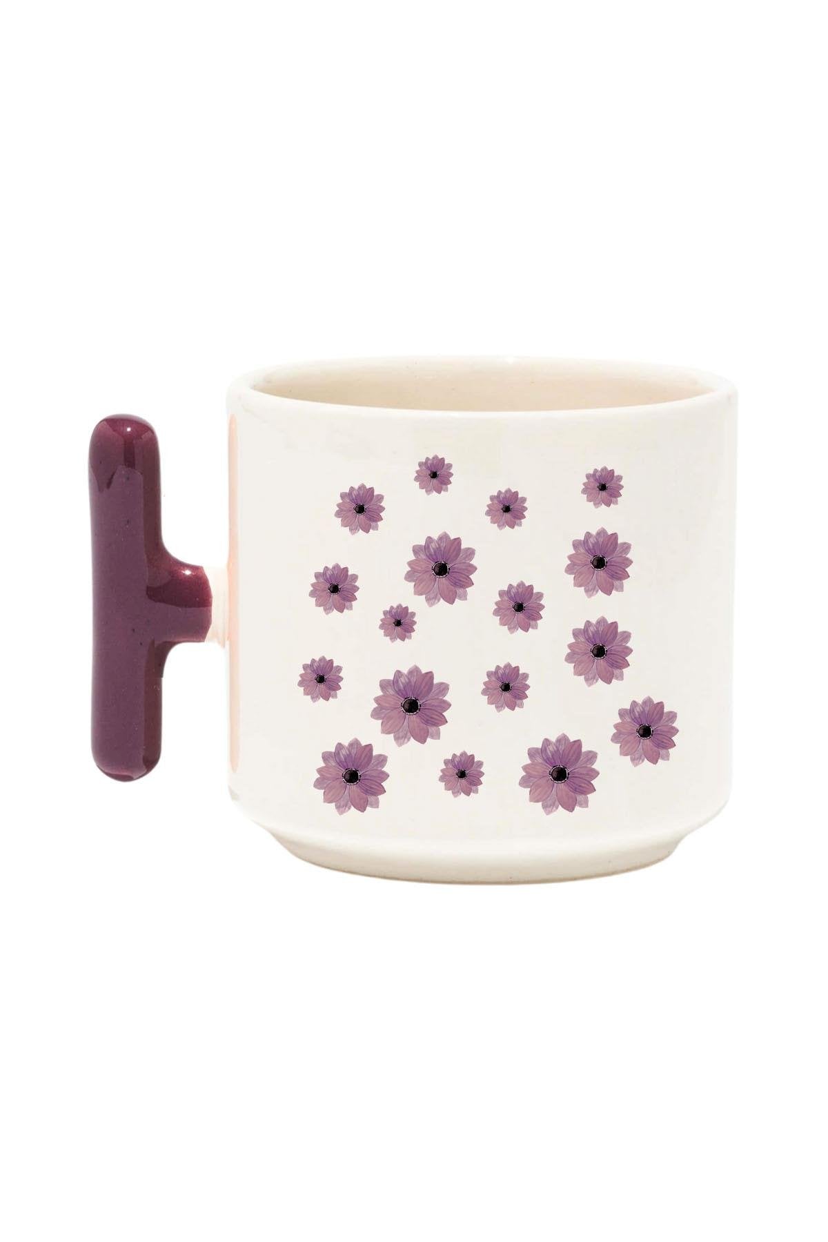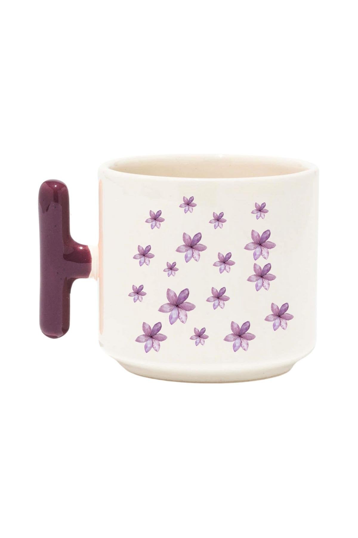 Lila Tonlarında Çiçekler Baskılı Renkli T Kulplu Latte Fincanı Kupa Bardak