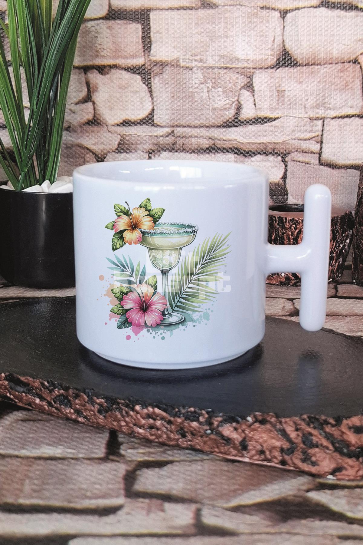 Margarita Kokteyl Ve Tropikal Çiçek Baskılı T Kulplu Latte Fincanı Kupa Bardak