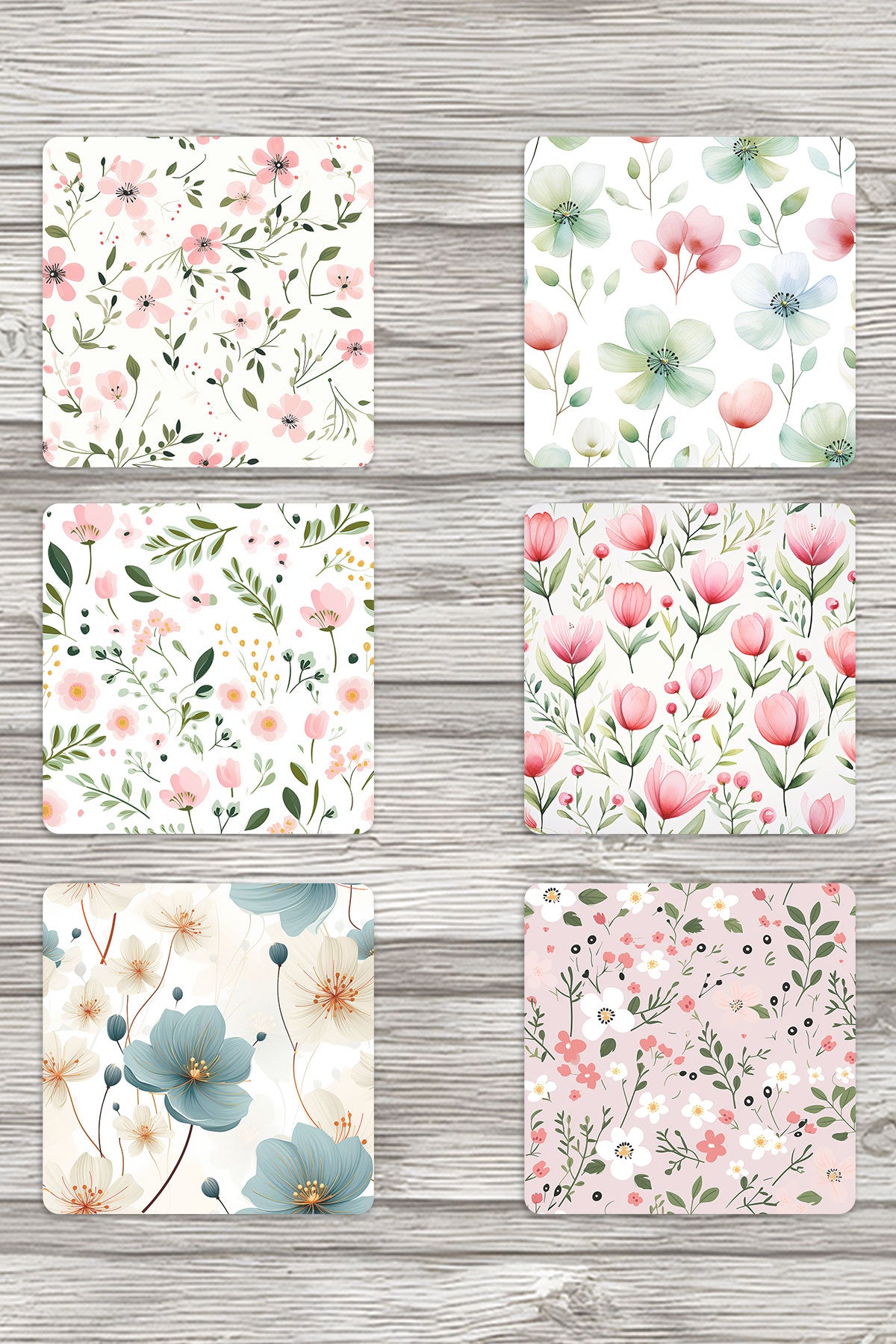 Minimal Çiçekler No:3 Baskılı 6'lı Set Dekoratif Ahşap Kare Bardak Altlığı