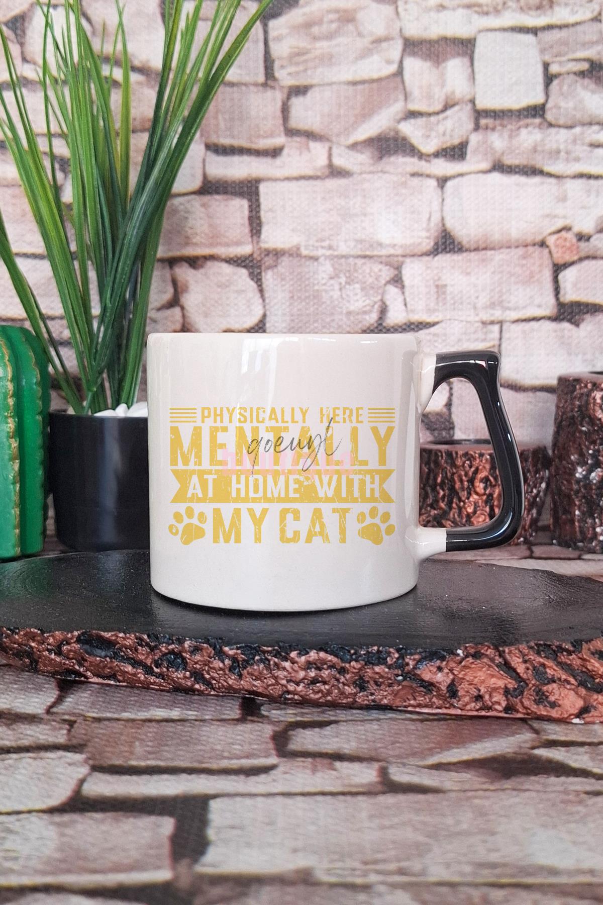 Physically Here Mentally At Home With My Cat Yazılı Kedi Hediyelik Kulplu Kupa Bardak