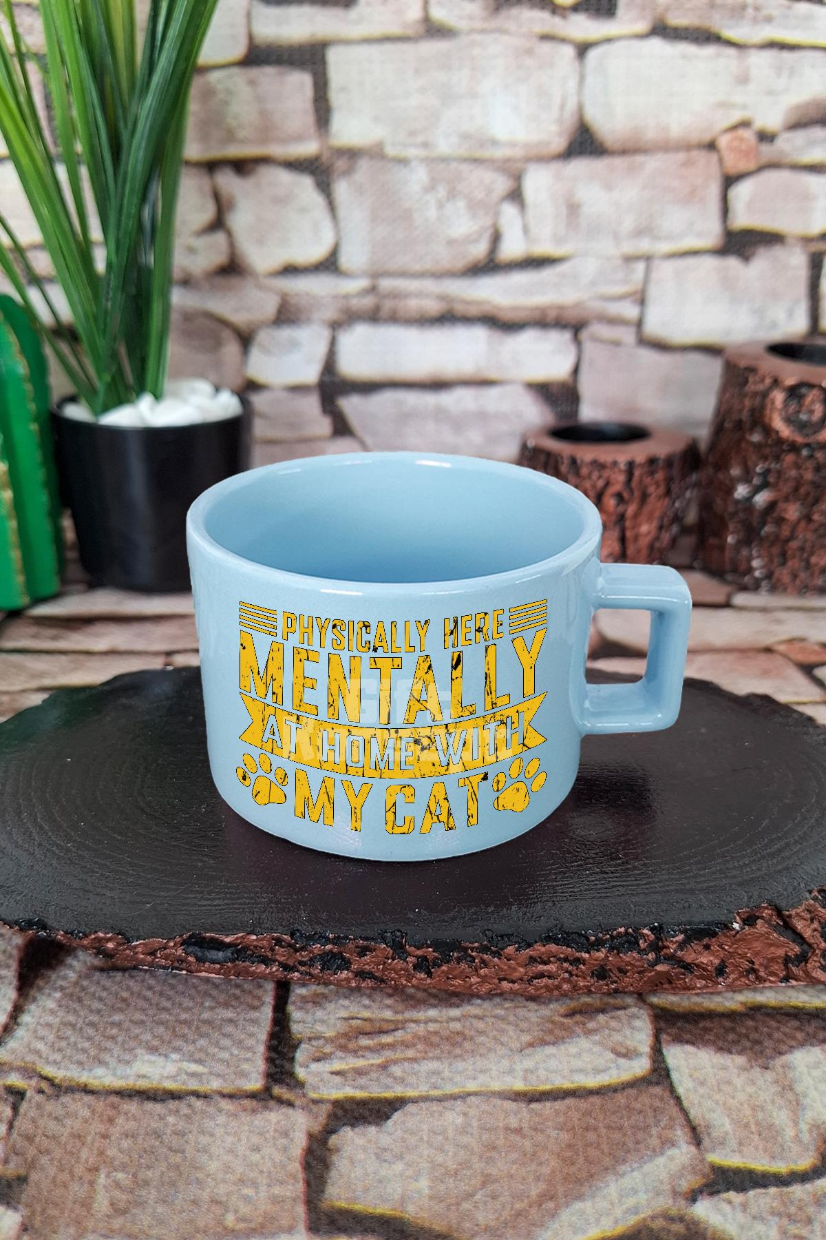 Physically Here Mentally At Home With My Cat Yazılı Kedi Kare Kulplu Fincan Mavi Kupa Bardak