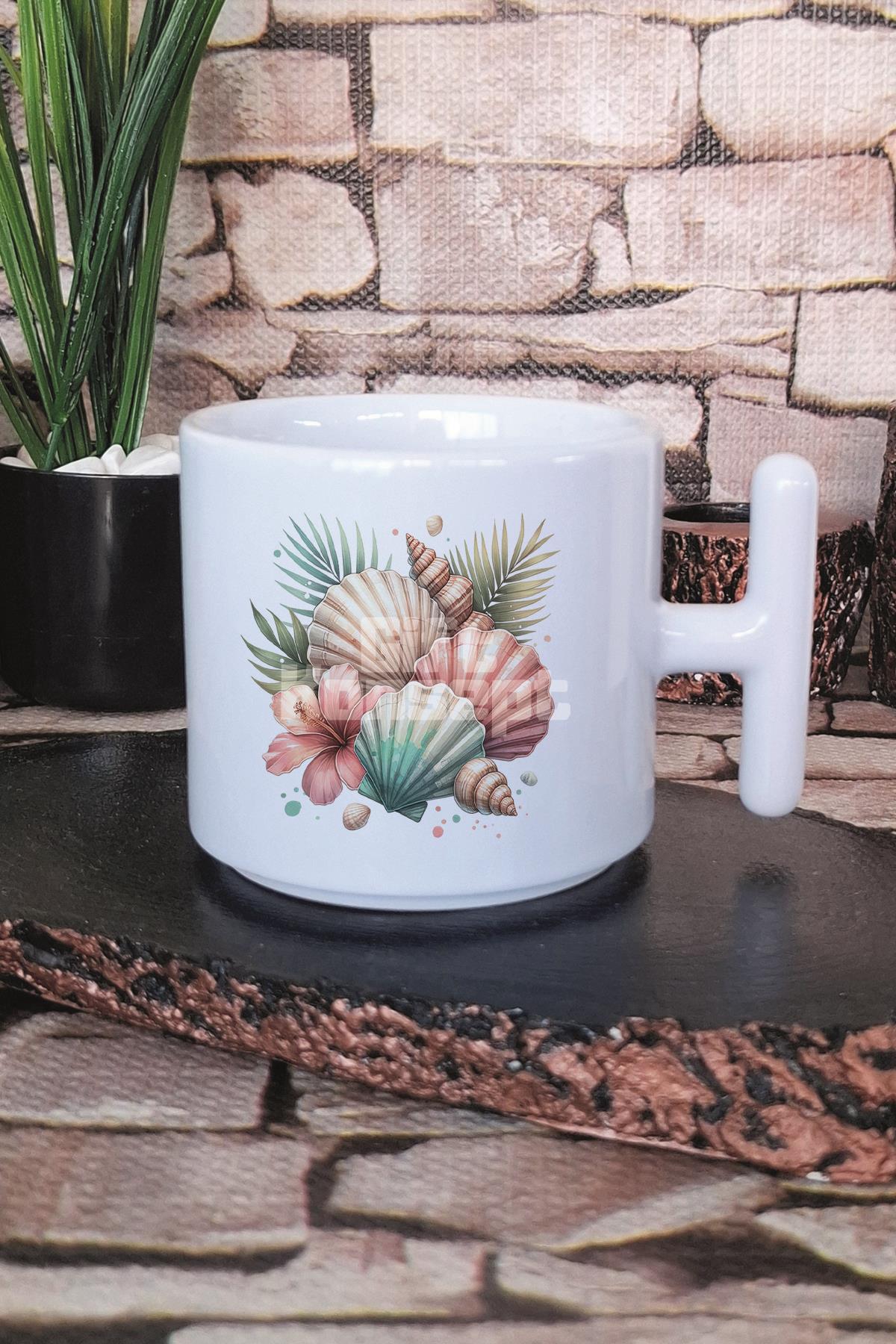 Renkli Deniz Kabukları Baskılı T Kulplu Latte Fincanı Kupa Bardak