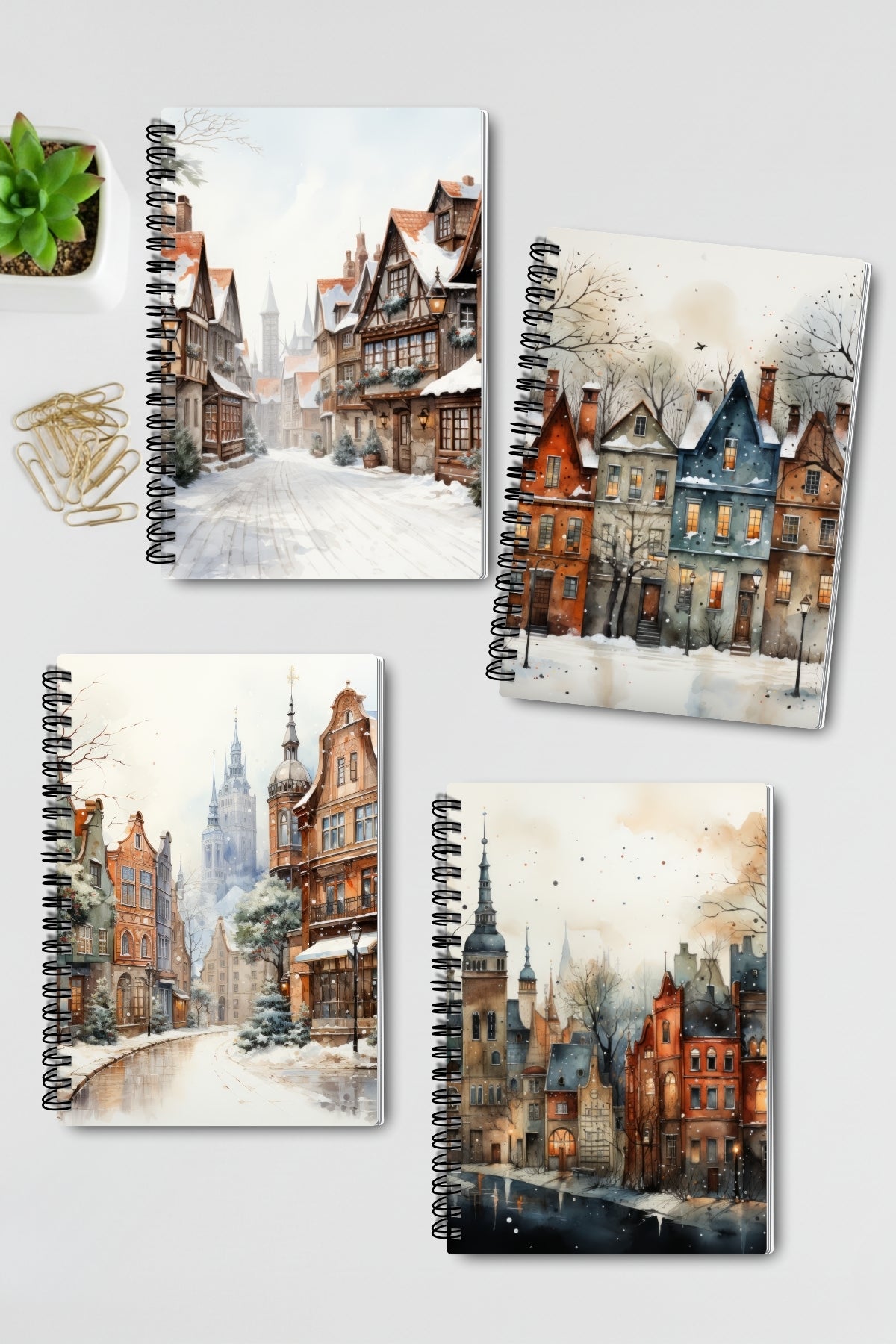Rustik Kış Temalı Şehirler Tasarım Tel Spiralli 4'lü Hatıra Günlük Ajanda Anı Okul Defter Seti