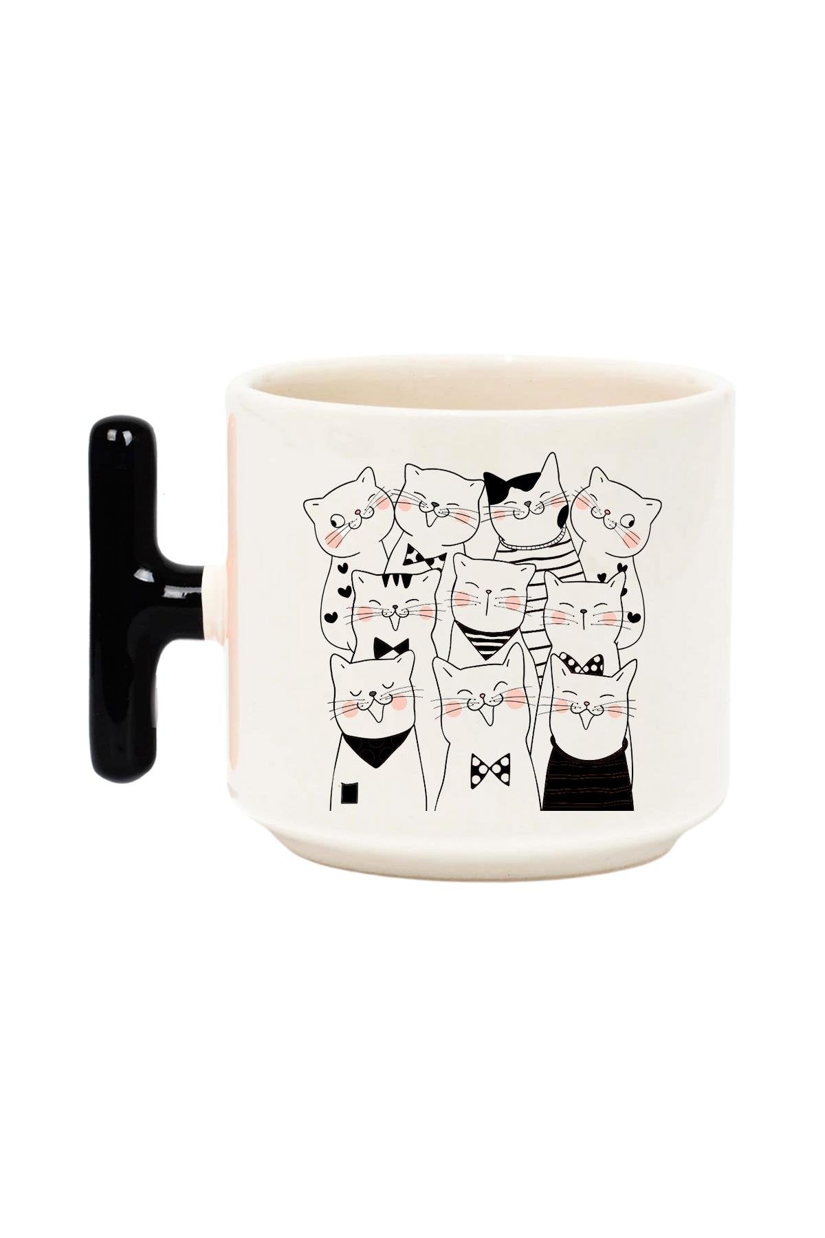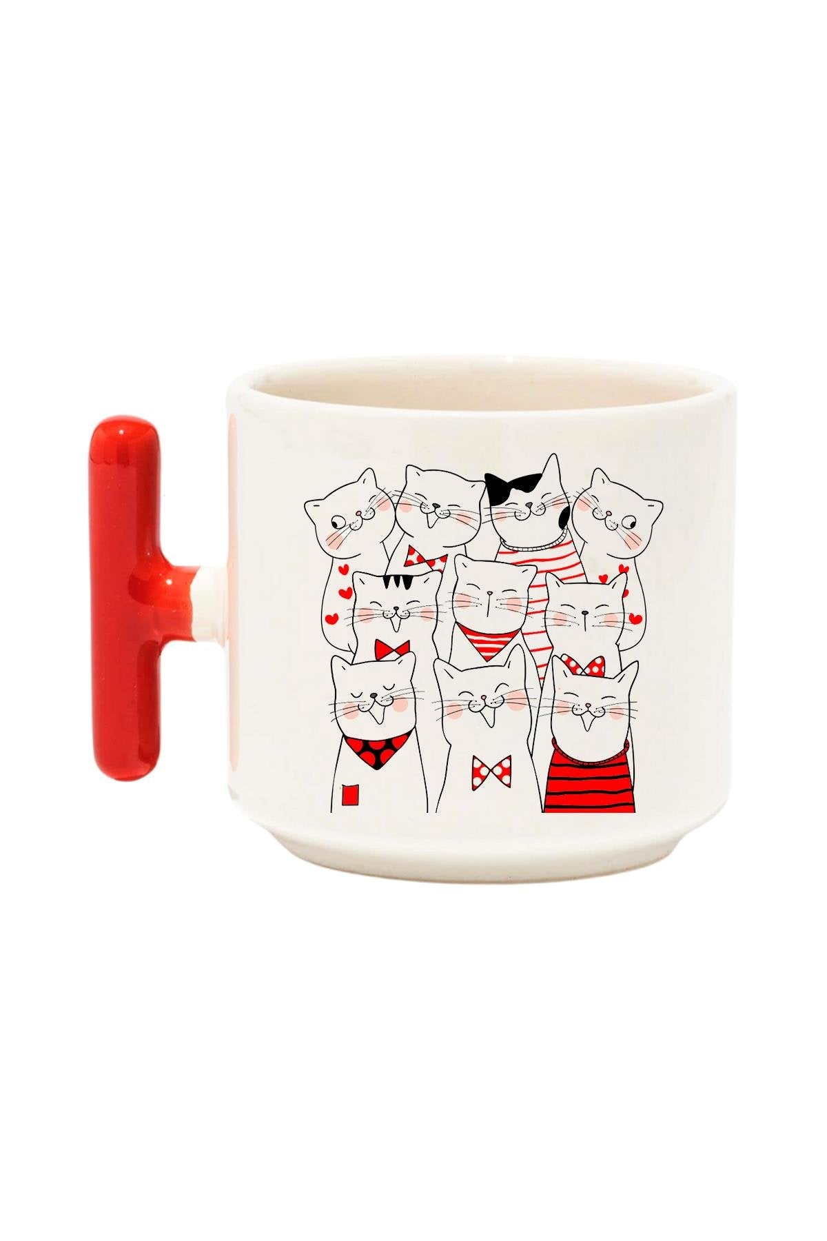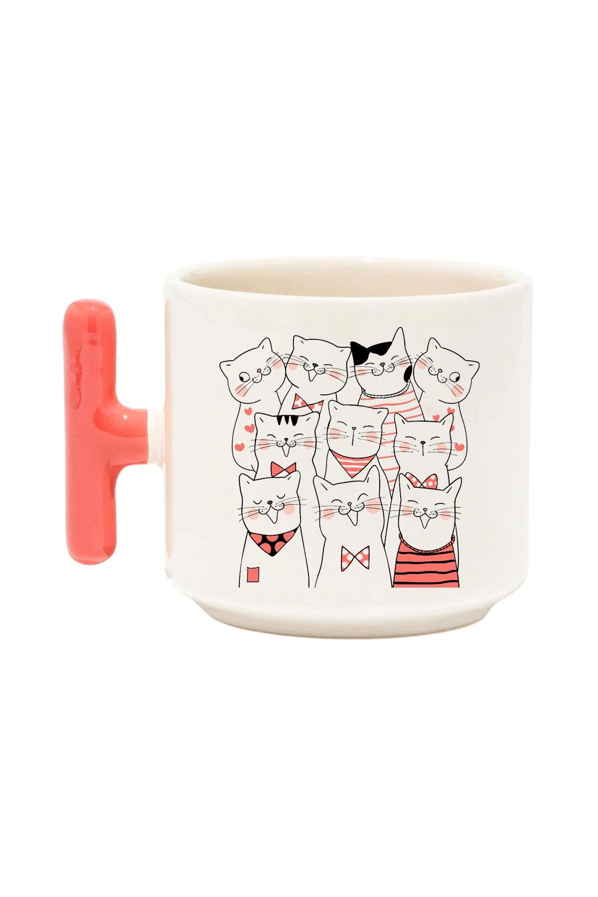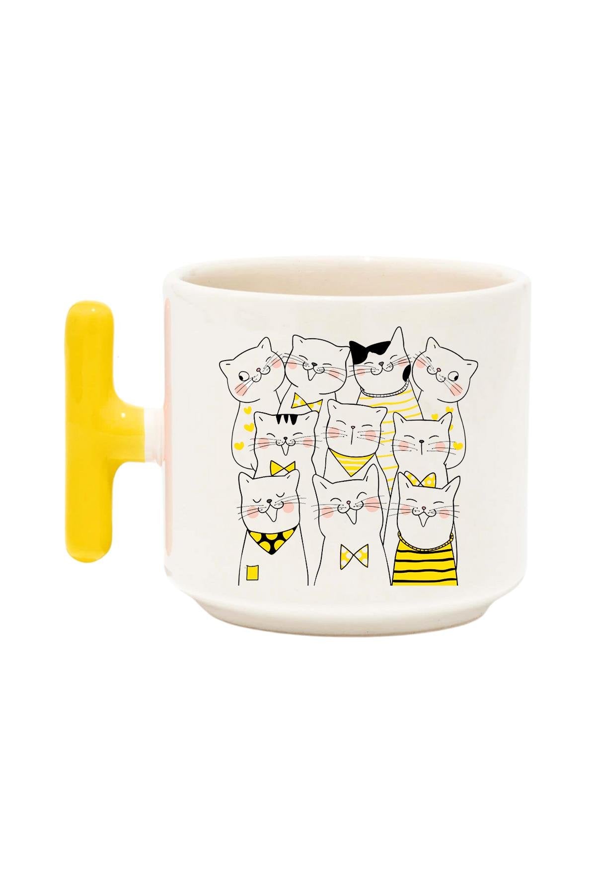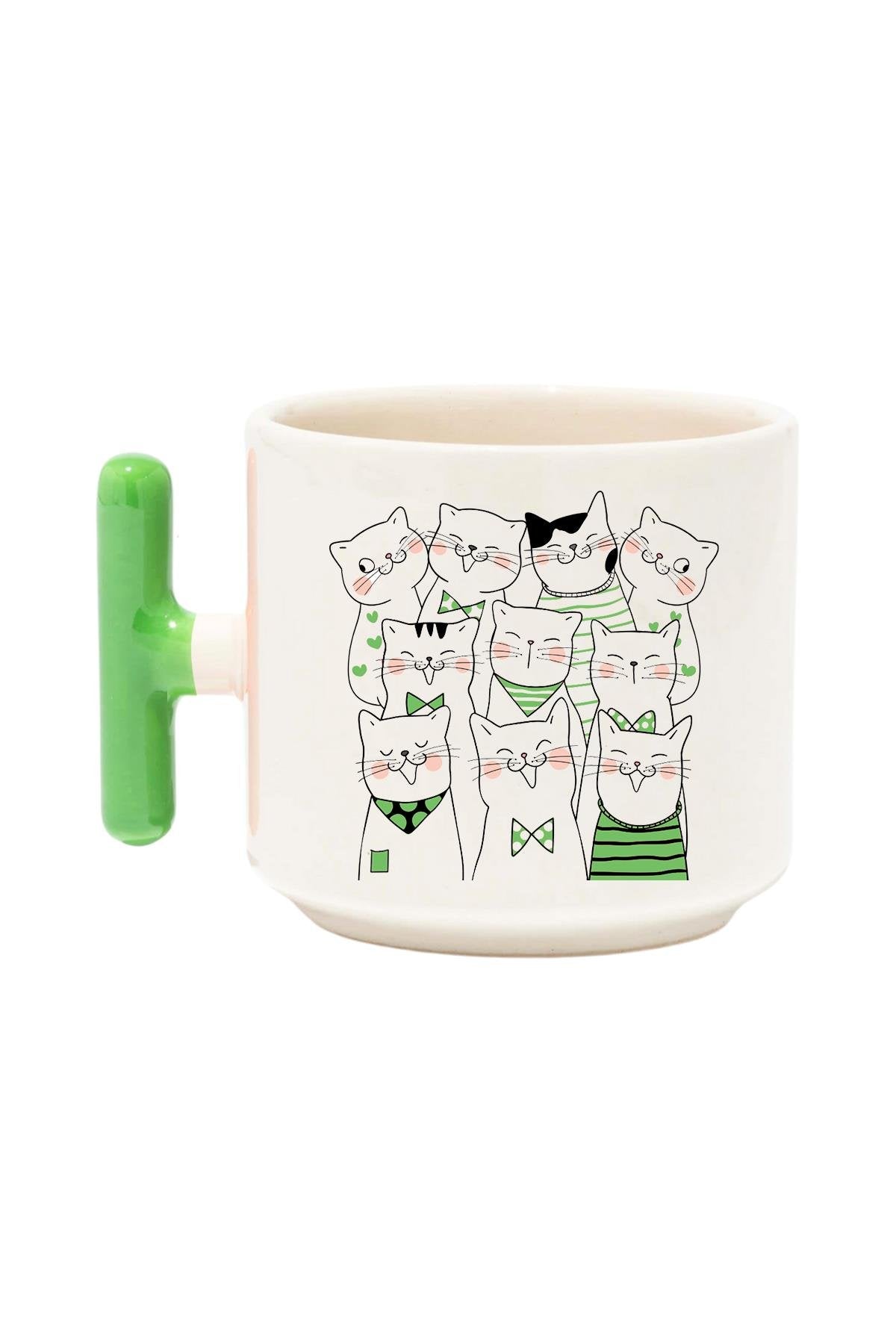 - Sevimli kedi baskısı ile süslenmiş, şık ve eğlenceli bir tasarıma sahip.; - Renkli t kulpları sayesinde hem sıcak içeceklerinizi keyifle yudumlayabileceğiniz hem de görsel olarak dikkat çeken bir aksesuar.; - Bulaşık makinesinde kolayca temizlenebilir olması pratik kullanım sağlar.; - Baskı ve fincanı ile mutfak dekorasyonunuza renk katarken aynı zamanda sevdiklerinize hediye edebileceğiniz zarif bir parça.; - 250 ml hacmiyle ideal boyutta olup günlük kullanım için uygundur; latte, kahve veya çay gibi içecekleri rahatlıkla servis edebilirsiniz.; - Yerli üretimdir; Türkiye'de üretilmiş olup yerel ekonomiye katkı sağlamaktadır.; - Kaliteli seramik malzemesi sayesinde uzun ömürlü kullanım sunar ve dayanıklılığıyla ön plana çıkar.;