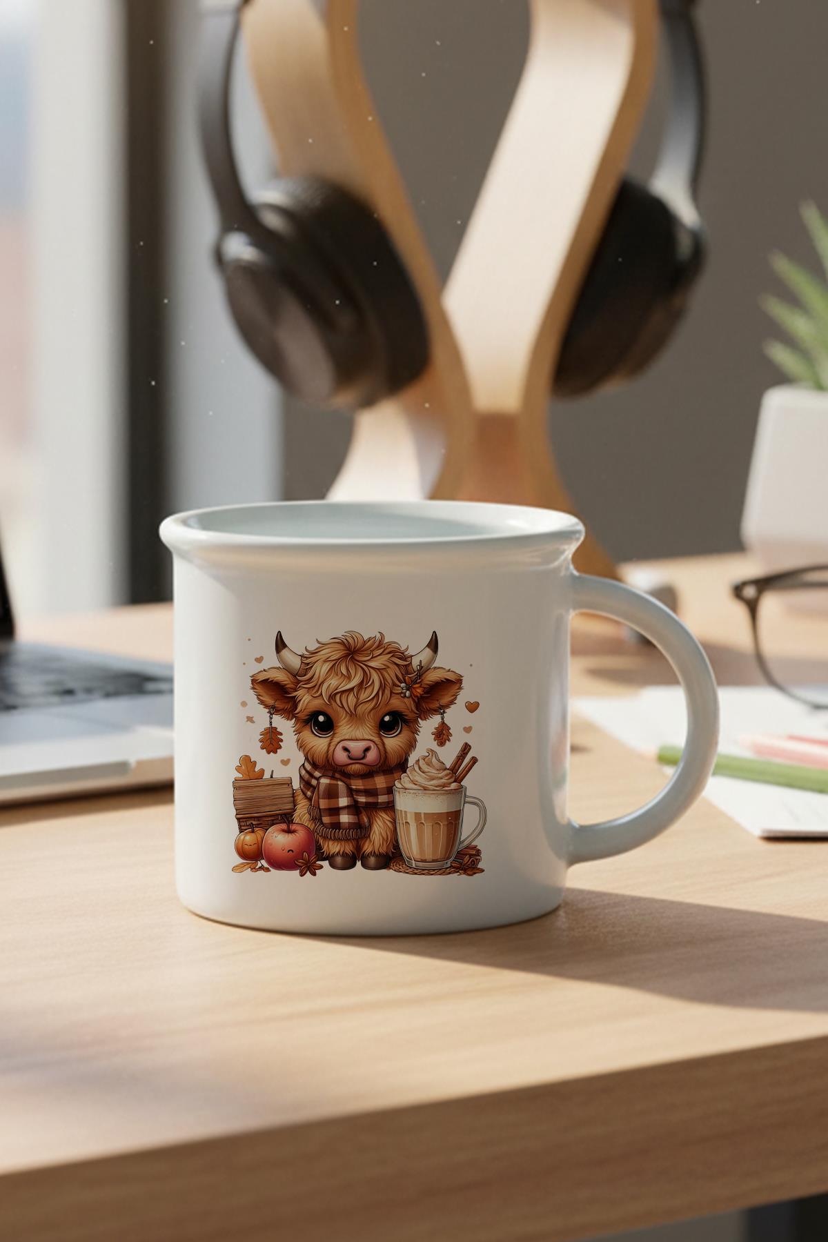 Sonabahar Teması Sevimli İnek Baskılı Enamel Görünümlü Seramik Vintage Kupa Bardak