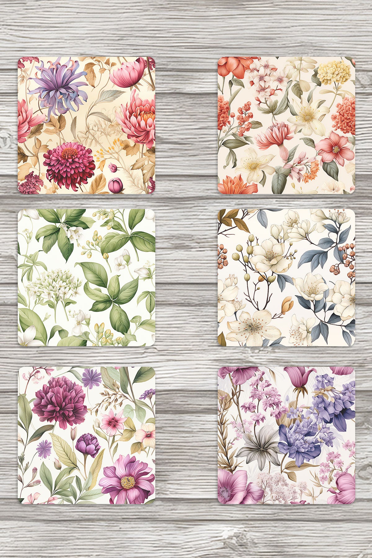 Sonbahar Botanik Çiçekler No:2 Baskılı 6'lı Set Dekoratif Ahşap Kare Bardak Altlığı