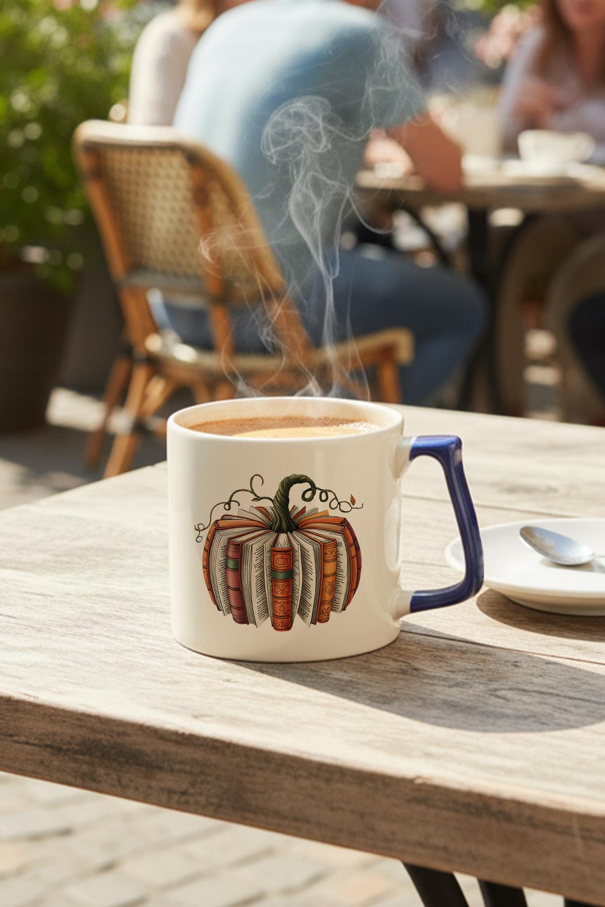 Sonbahar Temalı Balkabağı Kitaplar Baskılı Lacivert D Kulplu Kupa Bardak