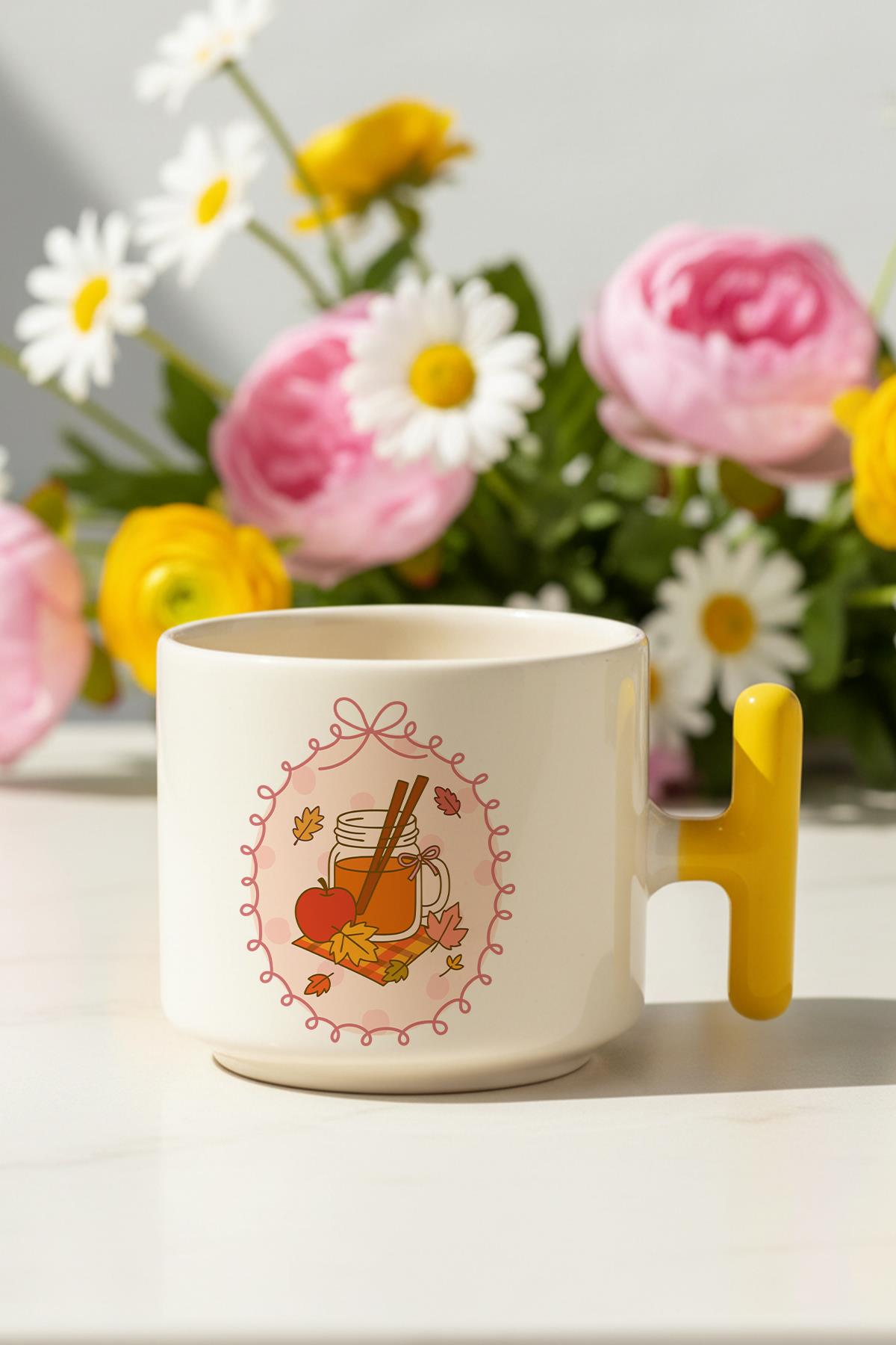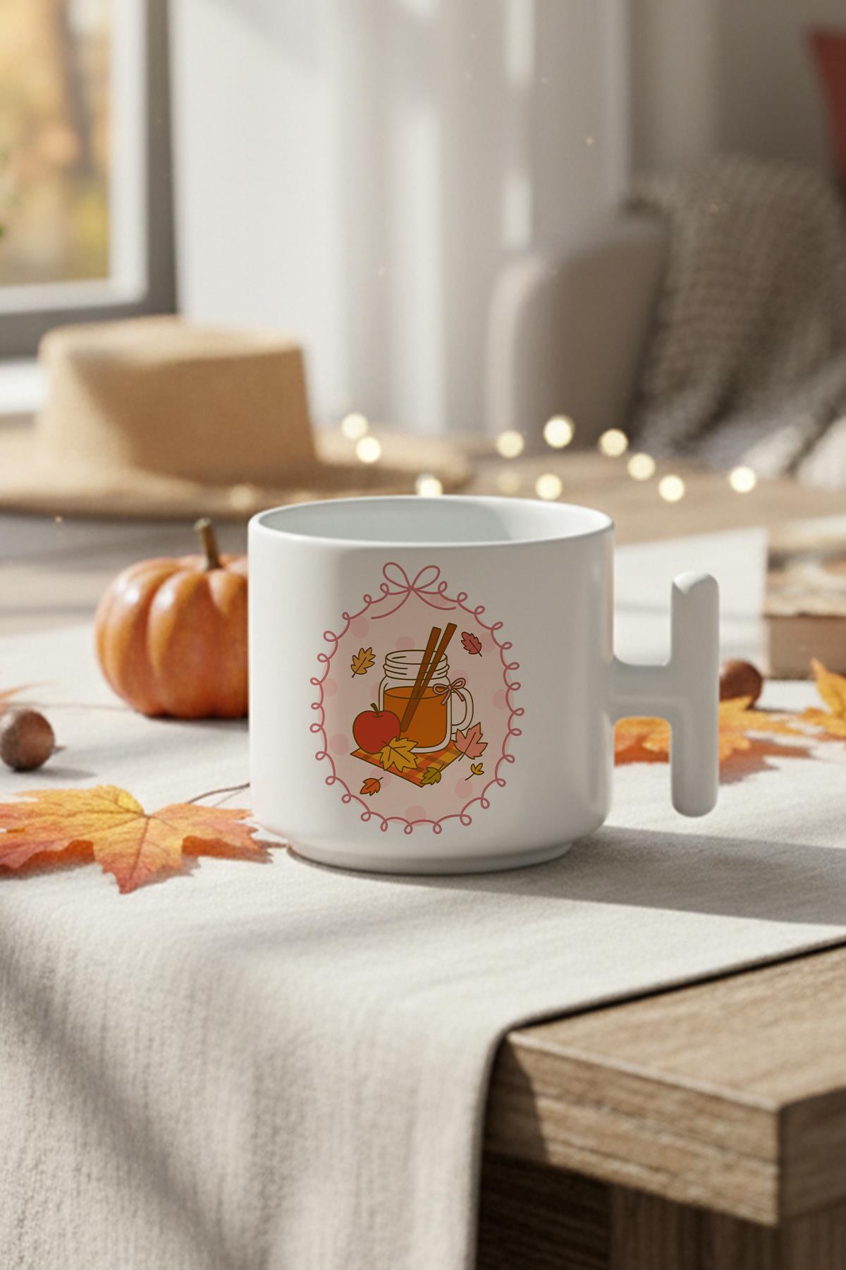 Sonbahar Temalı Elma Baskılı Hediyelik T Kulplu Latte Fincanı Kupa Bardak