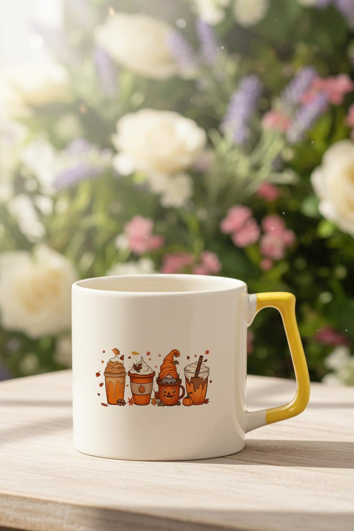 Sonbahar Temalı Kahveler No:6 Baskılı Sarı D Kulplu Kupa Bardak