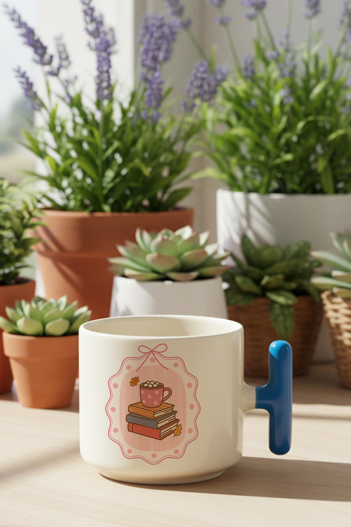 Sonbahar Temalı Kitaplar Ve Sıcak Çikolata Baskılı Hediyelik T Kulplu Latte Fincanı Kupa Bardak