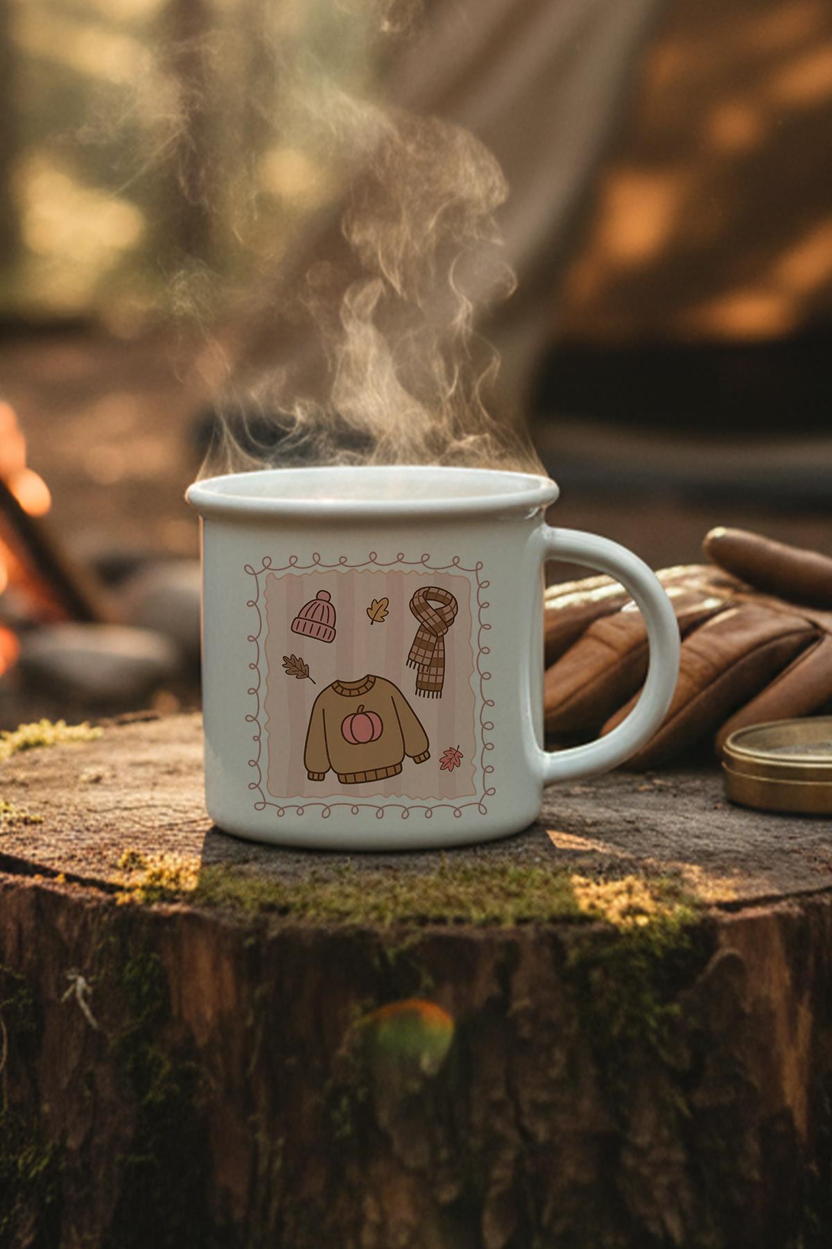 Sonbahar Temalı Kıyafetler Baskılı Enamel Görünümlü Seramik Vintage Kupa Bardak