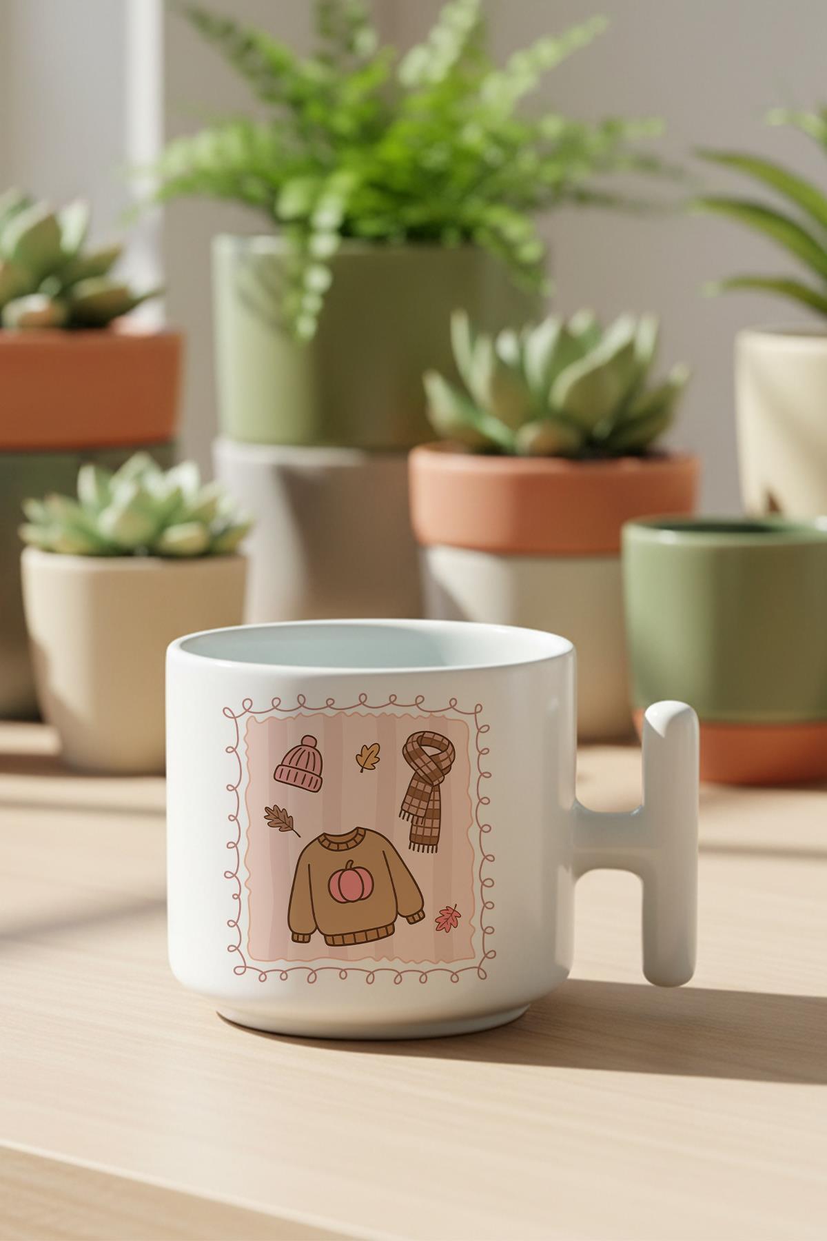 Sonbahar Temalı Kıyafetler Baskılı Hediyelik T Kulplu Latte Fincanı Kupa Bardak