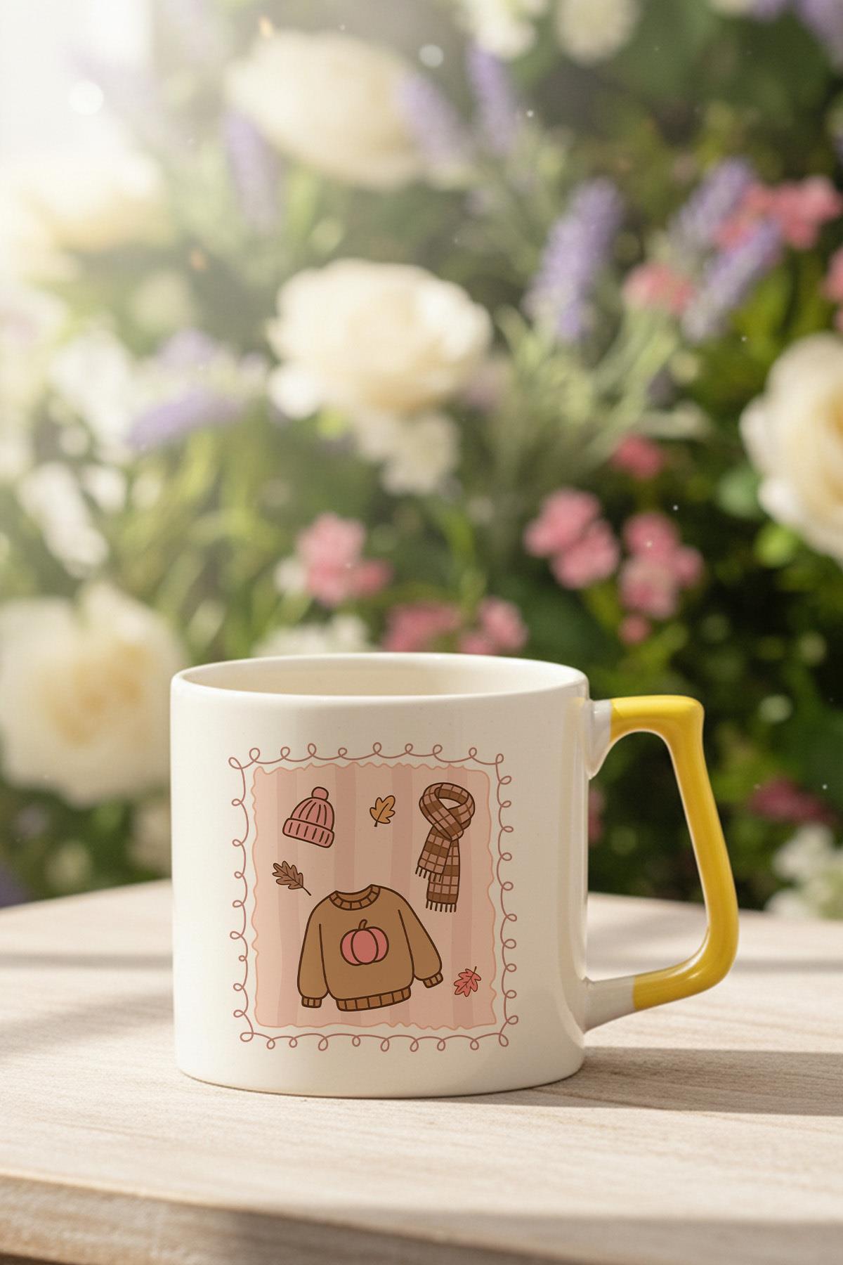 Sonbahar Temalı Kıyafetler Baskılı Sarı D Kulplu Kupa Bardak