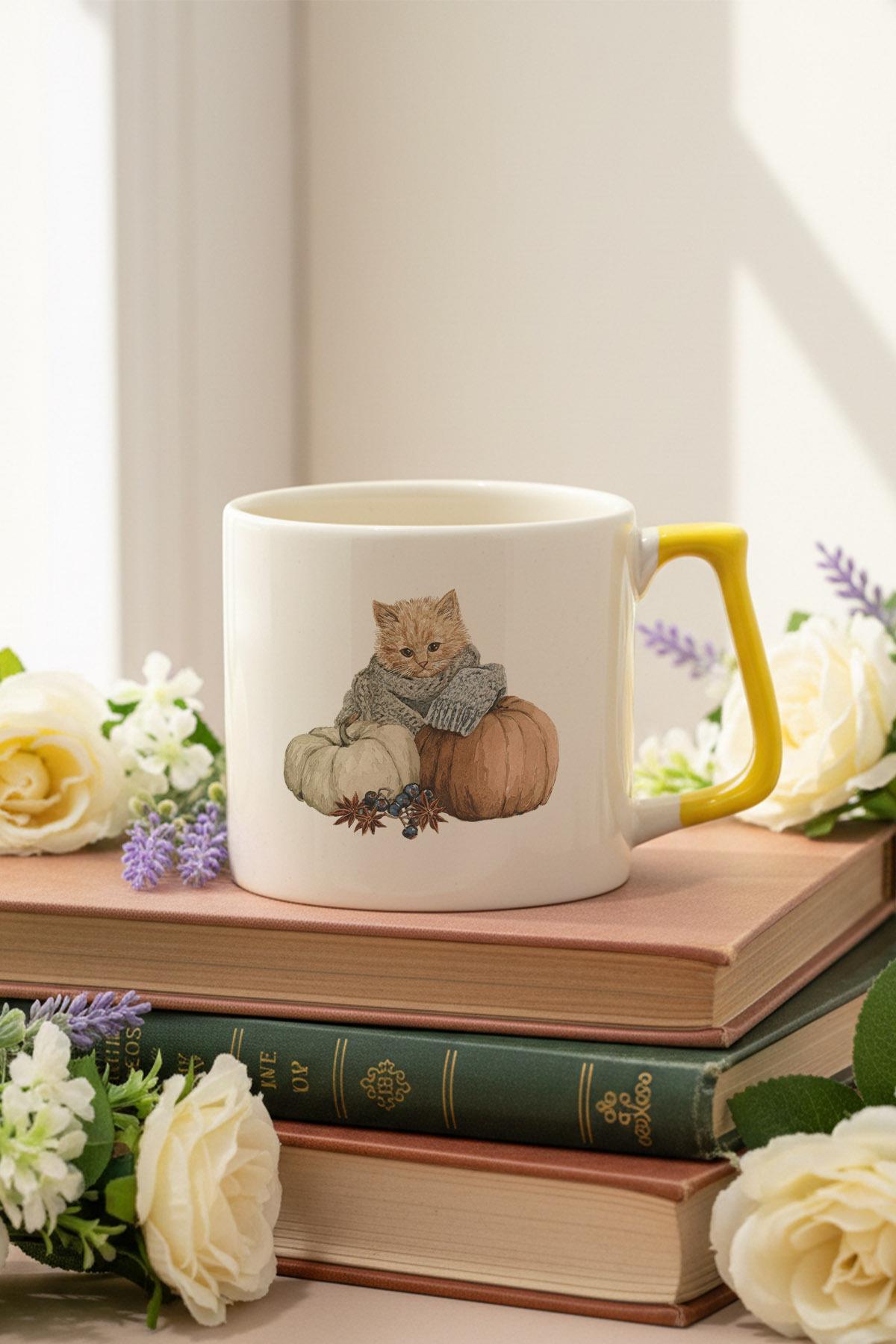 Sonbahar Temalı Sevimli Kedi No:11 Baskılı Sarı D Kulplu Kupa Bardak