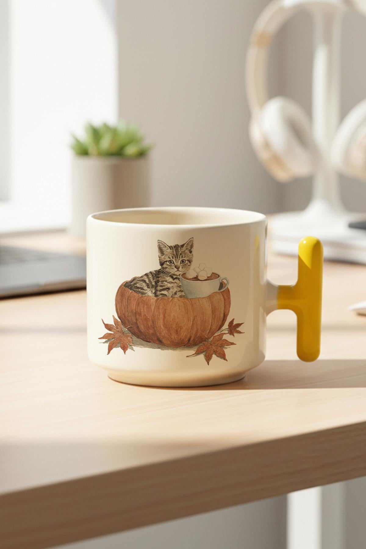 Sonbahar Temalı Sevimli Kedi No:4 Baskılı Hediyelik T Kulplu Latte Fincanı Kupa Bardak