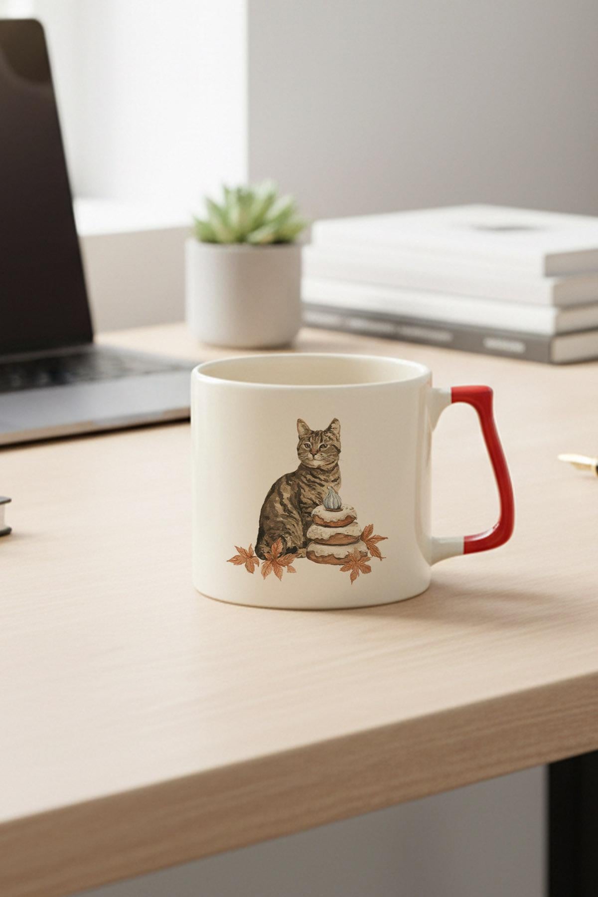 Sonbahar Temalı Sevimli Kedi No:7 Baskılı Kırmızı D Kulplu Kupa Bardak