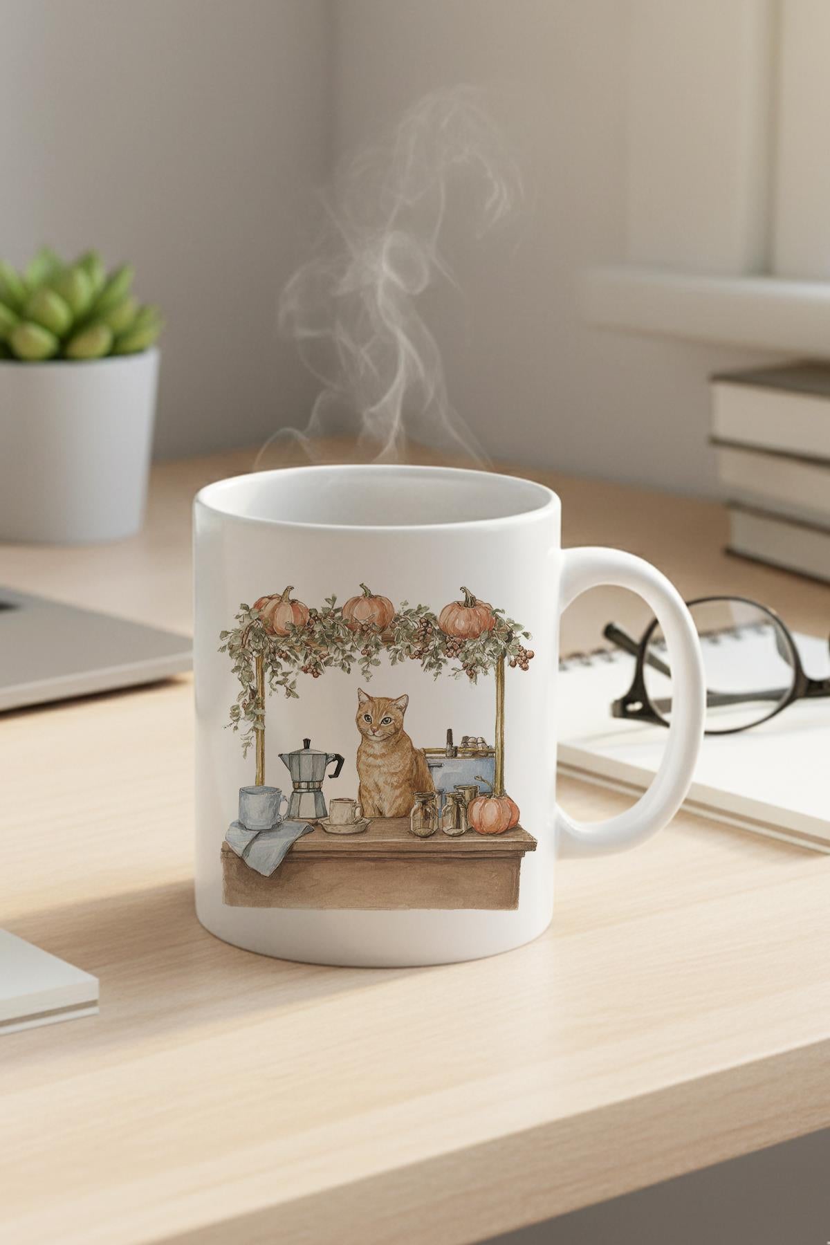 Sonbahar Temalı Sevimli Kedi No:8 Baskılı Hediyelik Kupa Bardak