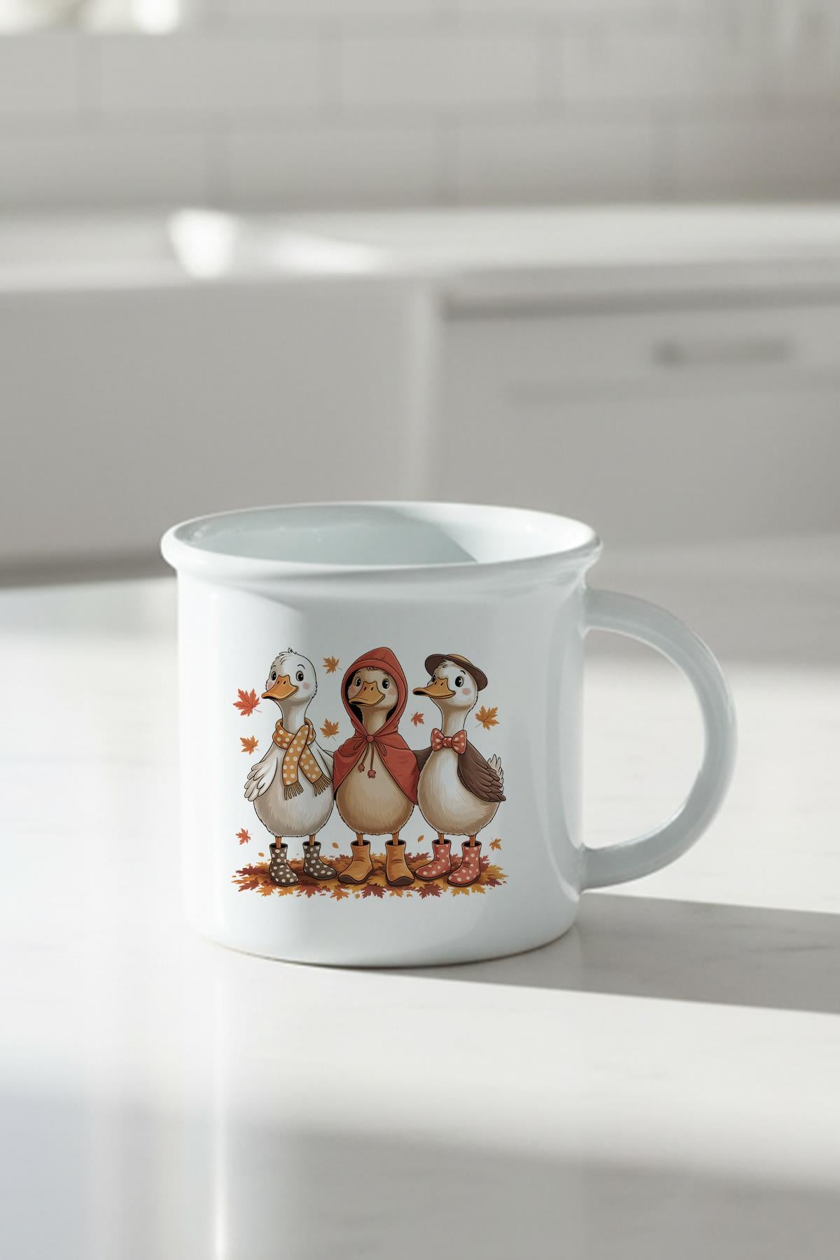 Sonbahar Temalı Sevimli Ördekler Baskılı Enamel Görünümlü Seramik Vintage Kupa Bardak