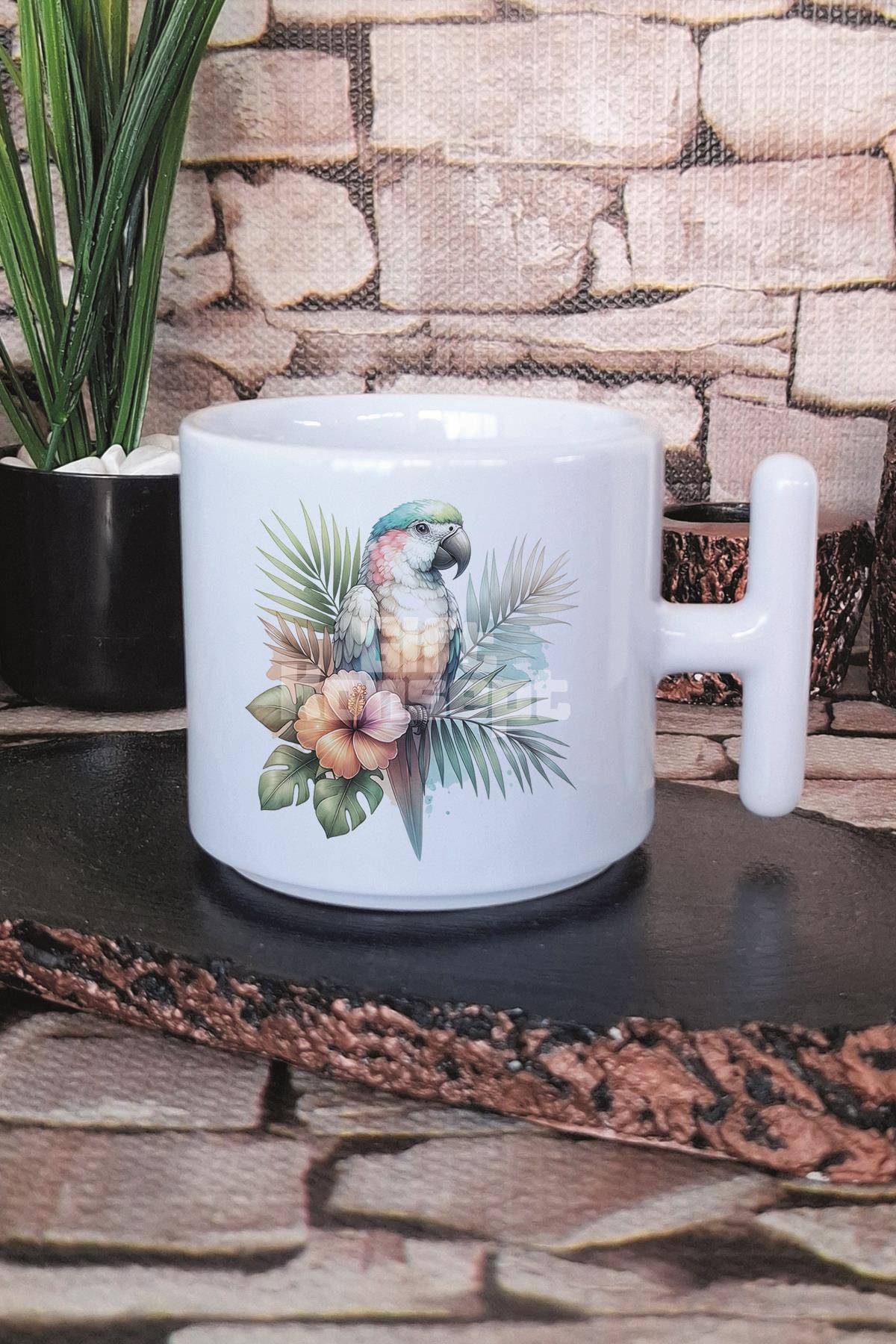 Tropikal Papağan Baskılı T Kulplu Latte Fincanı Kupa Bardak