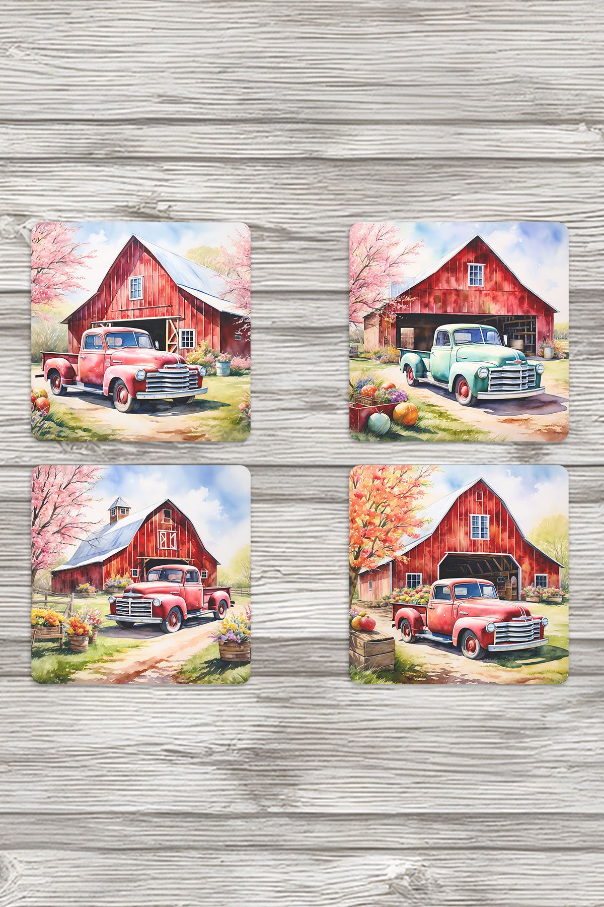 Vintage Araba Çiftlik Baskılı 4'lü Set Dekoratif Ahşap Kare Bardak Altlığı
