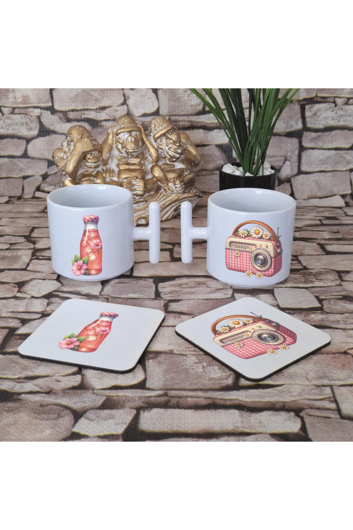 Yaz Temalı Bohem Radyo Baskılı 4'lü Set Ahşap Bardak Altlığı ve Latte Fincanı T Kulplu Kupa Bardak