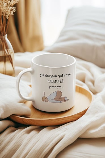 Yıkıldıysak Yatarız. Kalkmaya Gerek Yok Baskılı Eğlenceli Beyaz Kupa Bardak