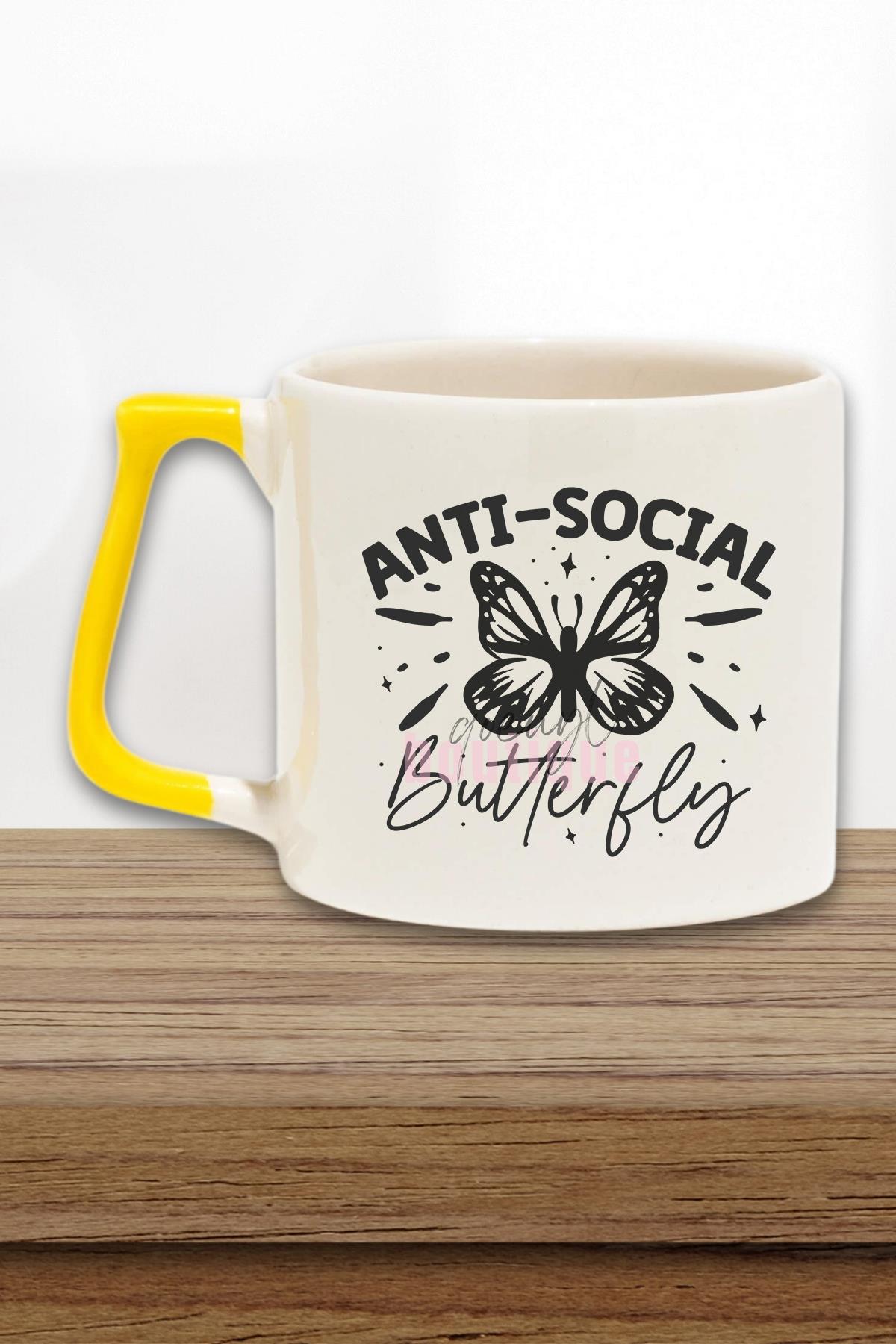 Anti Social Butterfly Baskılı Komik Anti Sosyal Kelebek Hediyelik Kulplu Kupa Bardak