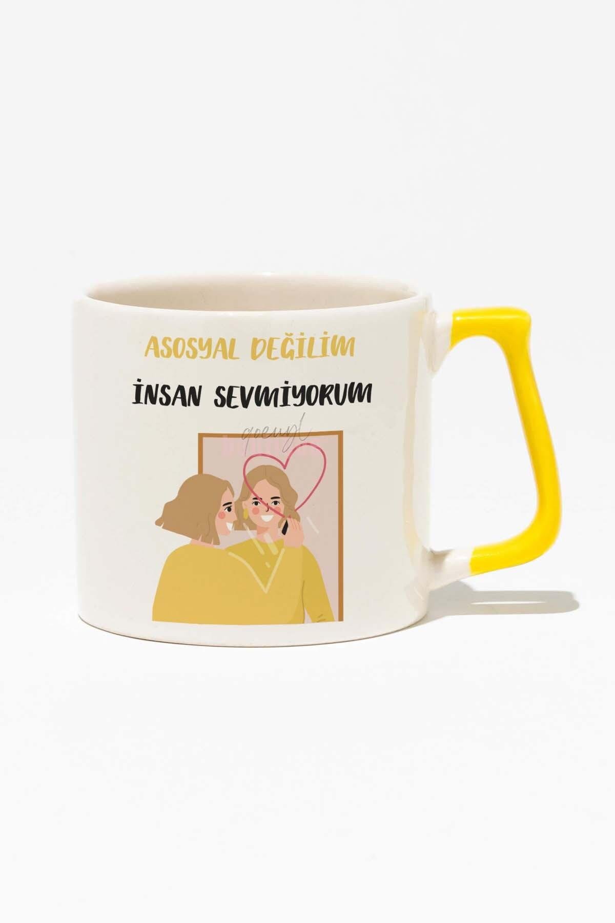 Asosyal Değilim İnsan Sevmiyorum-4 Hediyelik Eğlenceli Baskılı Sarı Kulplu Modern Seramik Kupa