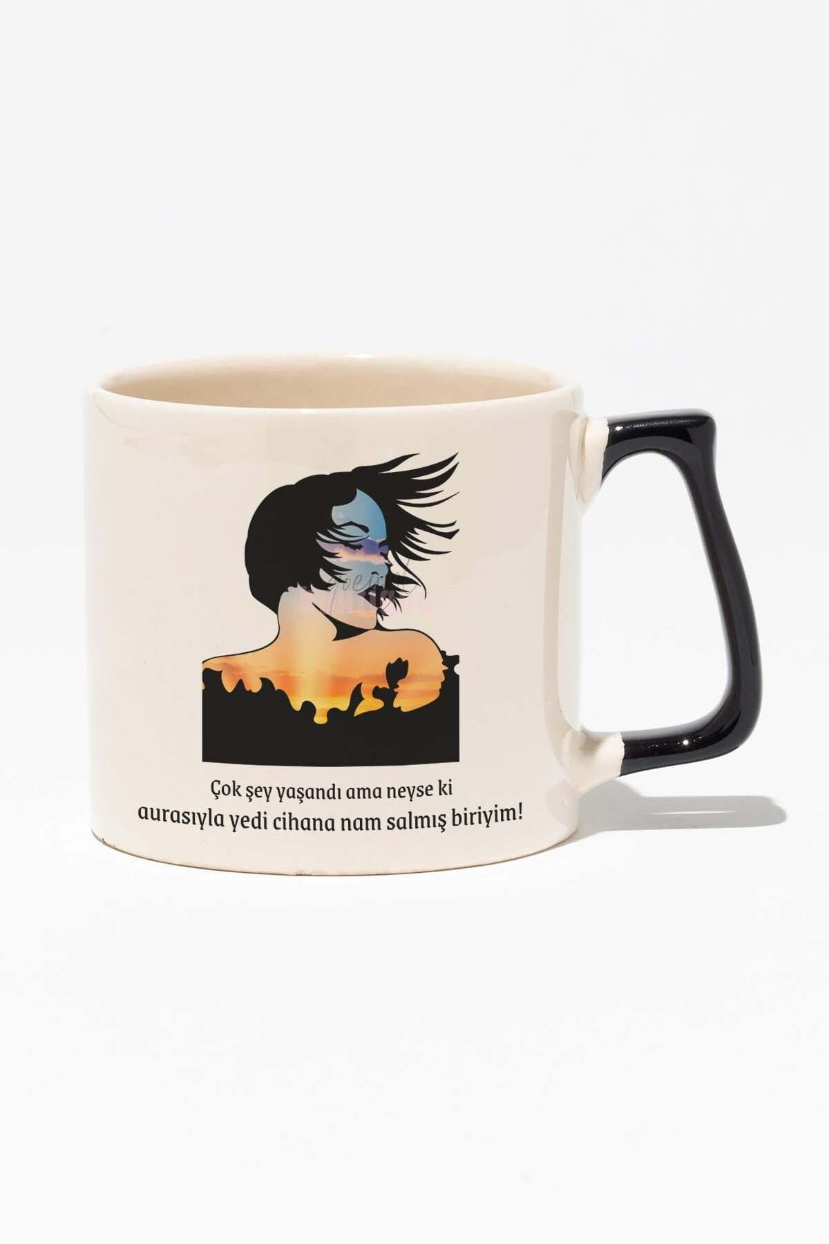 Aurasıyla Nam Salmış Birisiyim Eğlenceli Hediyelik Beyaz Baskılı Siyah Kulplu Modern Seramik Kupa
