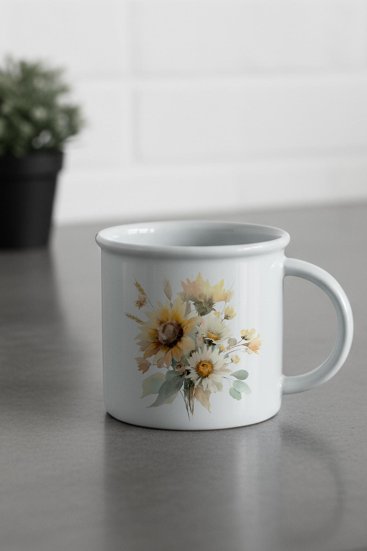 Ayçiçekleri Sonbahar Teması No:1 Baskılı Enamel Görünümlü Seramik Vintage Kupa Bardak